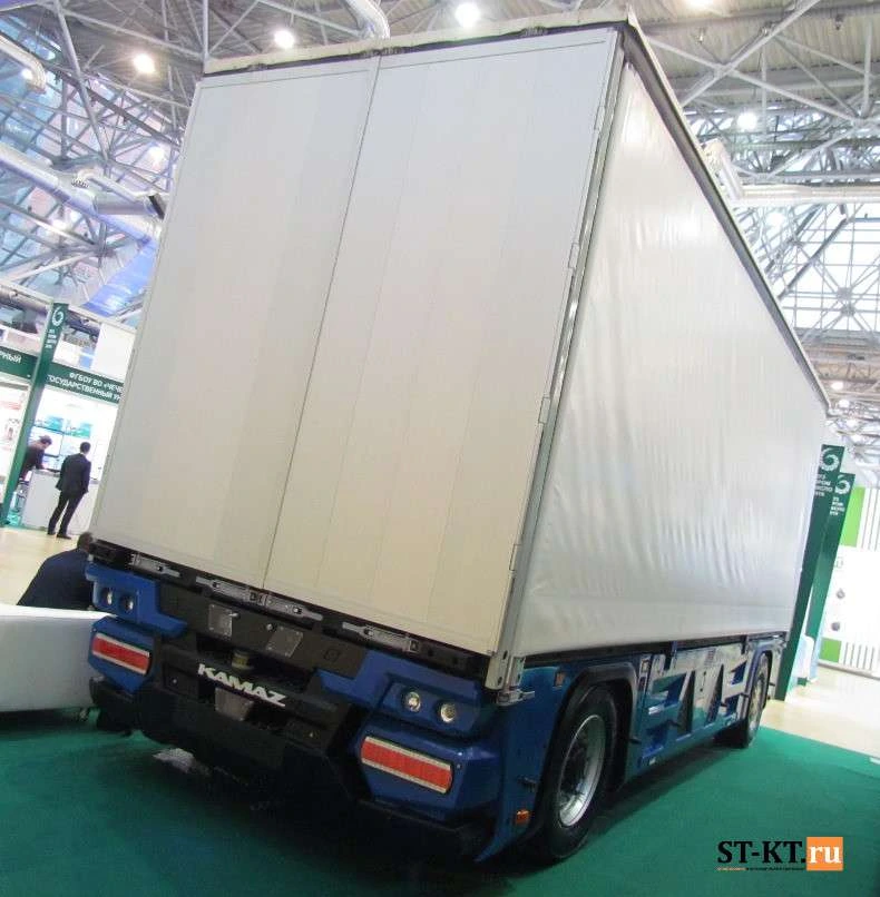 Машина разработана совместно с НАМИ и представляет собой беспилотную двухосную бортовую платформу, накрытую тентом. Издалека новинку можно принять просто за двухосный прицеп. Также нелегко определить, где передняя часть у машины, а где задняя.