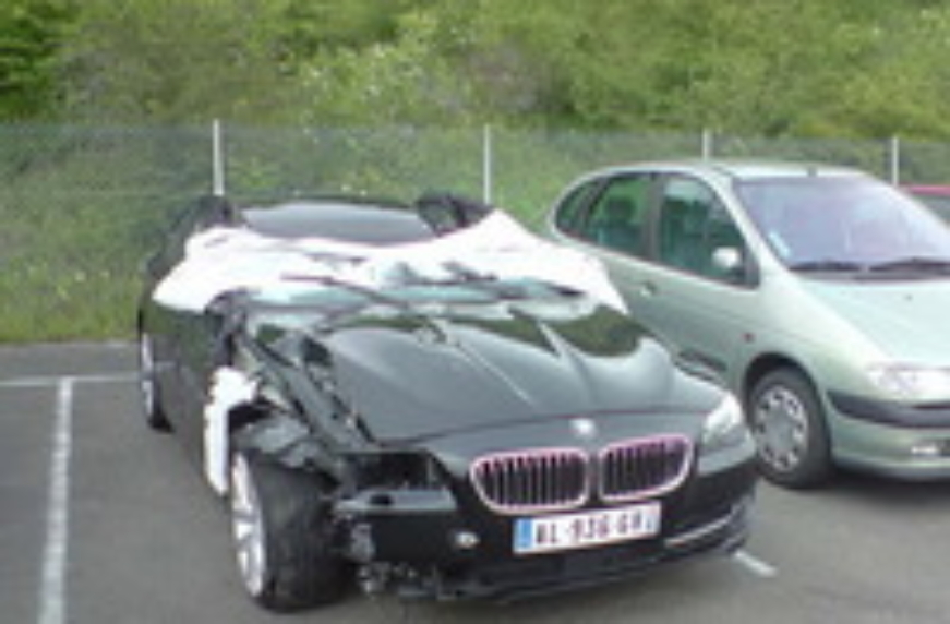 Баварский седан с французскими номерами попал в серьезную аварию. В результате проишествия пострадала правая сторона машины, и, особенно, крыша. Последняя буквально вогнулась внутрь автомобиля. Тем не менее боковые стойки кузова остались целыми.