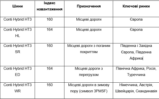 Новая модель Conti Hybrid HT3 WR расширяет проверенную линейку шин Conti Hybrid HT3 для прицепов, удовлетворяя особые требования различных рынков в Европе, на Ближнем Востоке и в Африке (EMEA). В этом году будут выпущены региональные Conti Hybrid HT3 SR (для европейских стран и Южной Африки) и Conti Hybrid HT3 ED (Extra Duty) для Турции и Северной Африки.