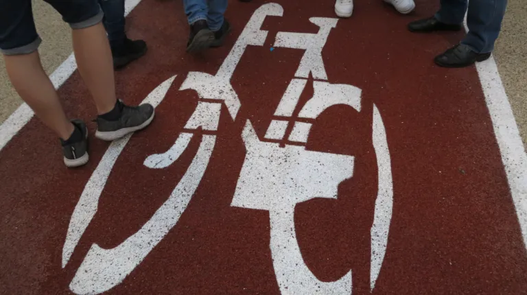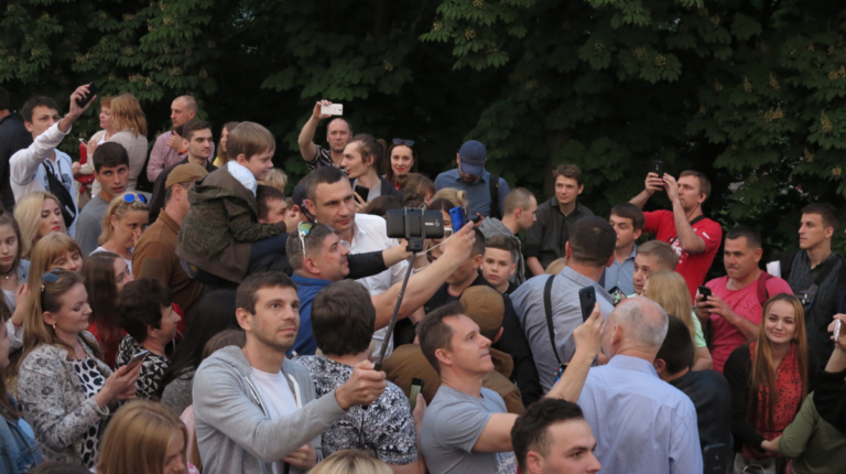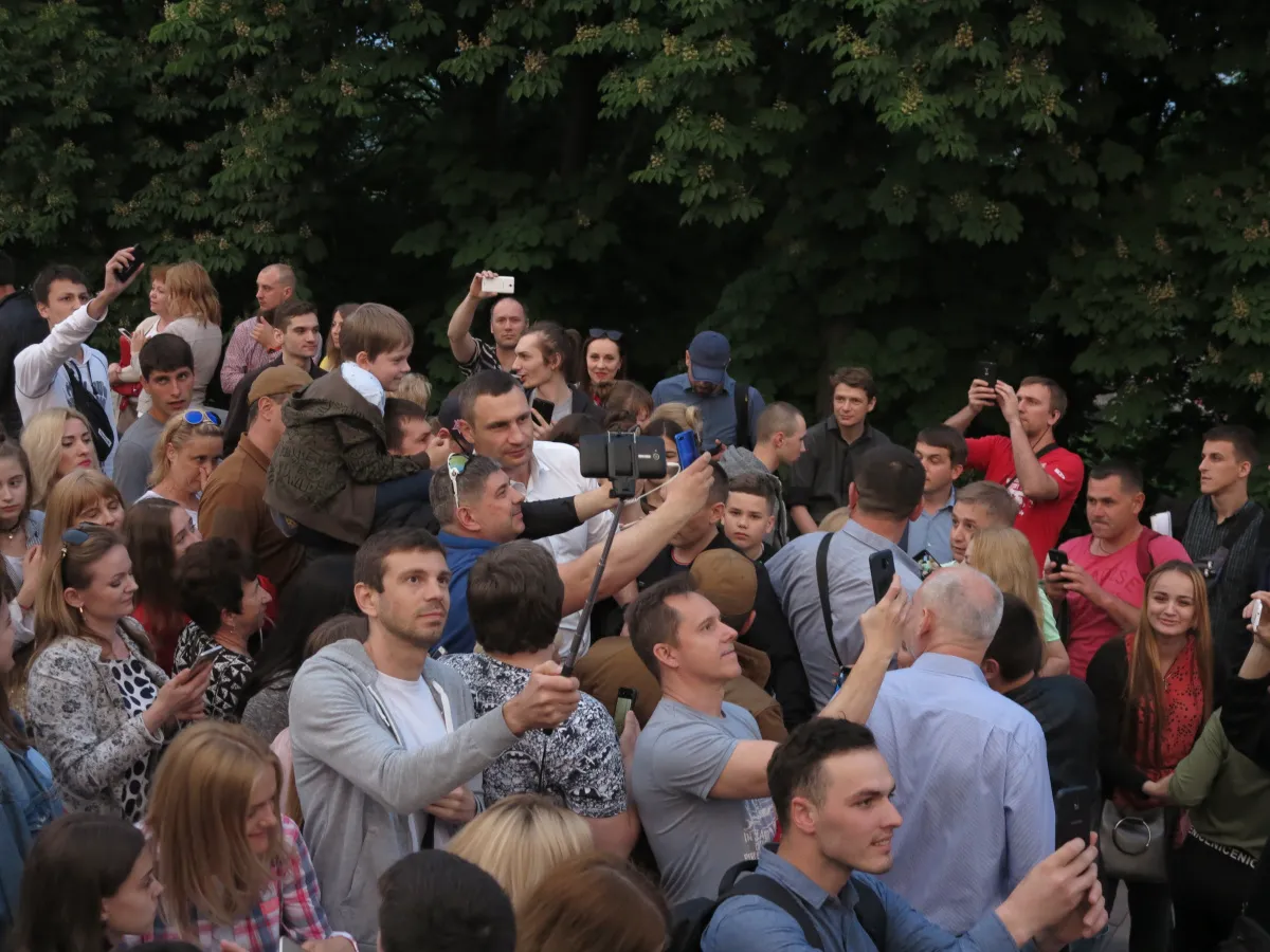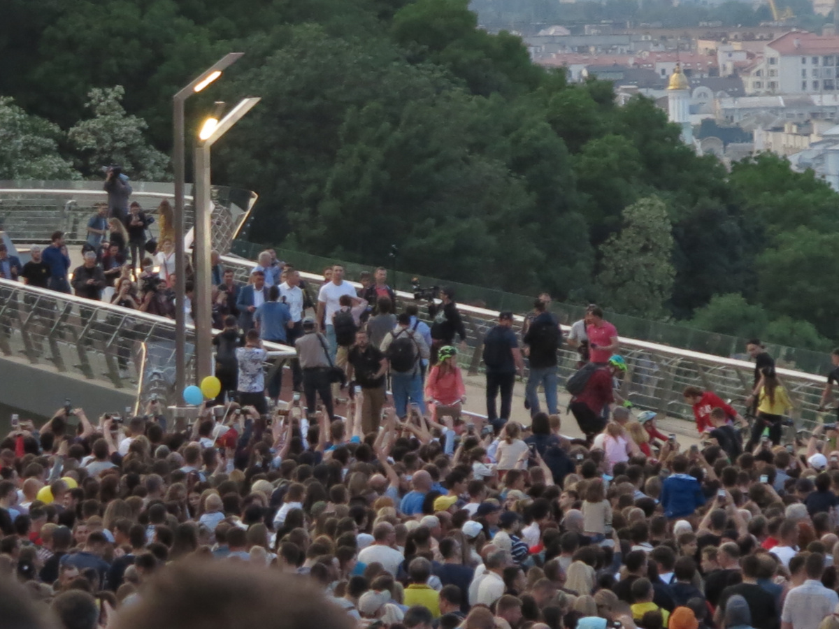 Открывать пешеходно-велосипедный мост приехал мэр Киева Виталий Кличко вместе со своим братом Владимиром. Они рассказали, что мост оснащен передовой системой видеонаблюдения, а потому вандализм будет строго наказываться. Под конец они продемонстрировали крепость смотровых окон в дорожках. Стекло, которое выдерживает нагрузку до 1000 кг на квадратный метр, запросто выдержало прыжки обоих братьев Кличко.
