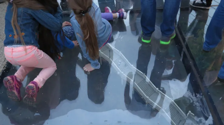 Открытый пешеходно-велосипедный мост отличается инновационной конструкцией – помимо бетона в нем активно использована сталь и, главное, стекло. Так, стеклянными сделаны не только парапеты, прямо в дорожки вмонтированы смотровые окна, через которые можно любоваться днепровскими кручами. Более того, посмотрев прямо под ноги, можно увидеть белоснежную лестницу, ведущую к старейшему памятнику Киева – Колонне Магдебургского права.