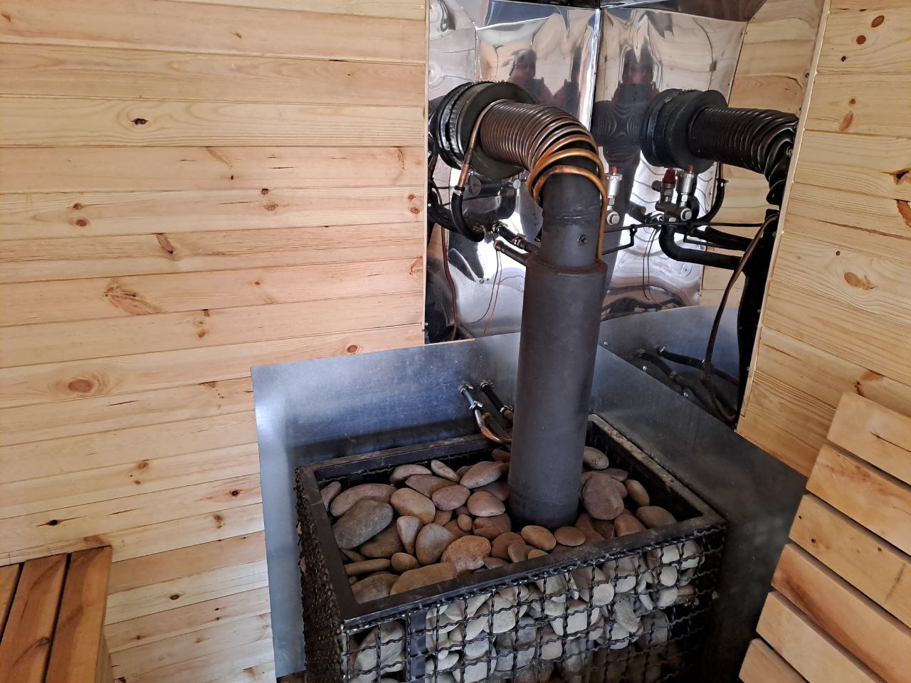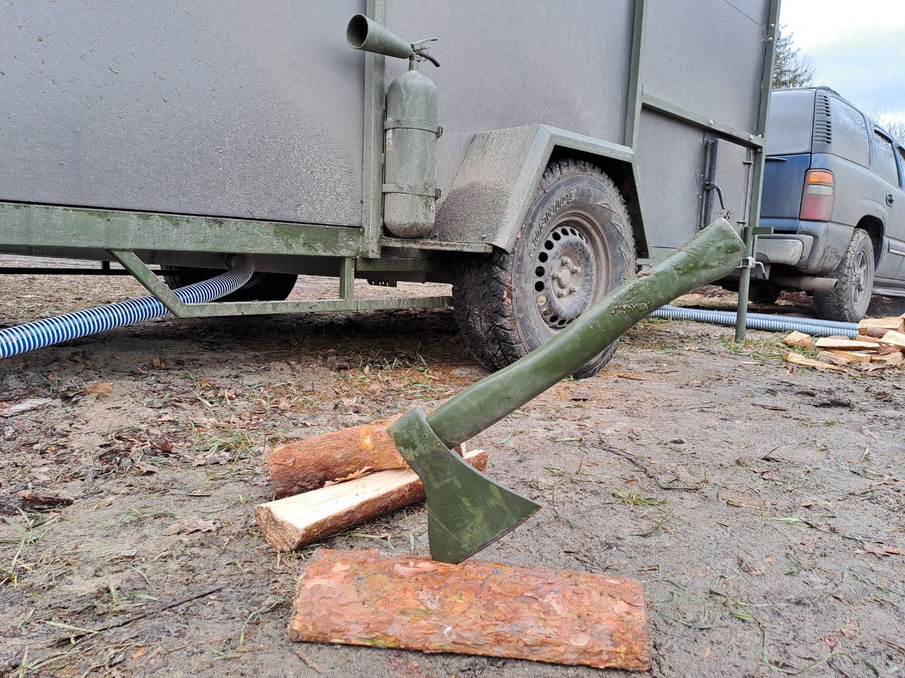 Недавно автобаня прошла испытание, настоящий тест в одном из подразделений недалеко от границы с картофельным диктатором. Проверяли ее работоспособность в реальных полевых условиях – дровами растопили печку в бане, нагрели воду для душа, а от генератора подключили стиральную машину.