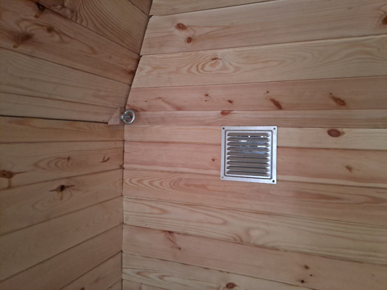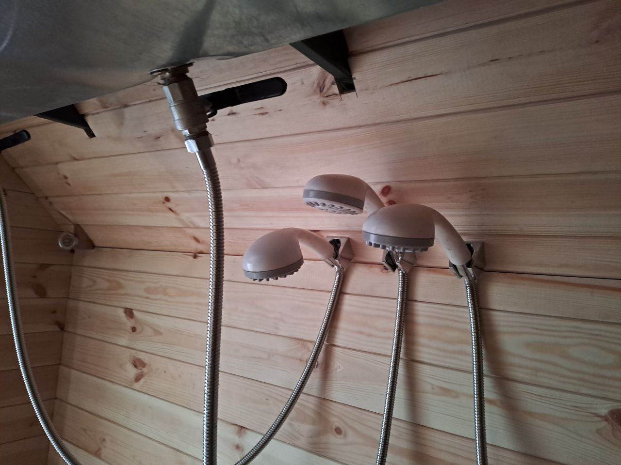 Емкость автобани составляет 750 литров, пластмассовые баки для воды находятся под лавками. Нагретая вода поступает в железный бак, который находится сверху под потолком бани. С него и поступает вода для принятия душа. Есть пульт управления с показателями напряжения аккумулятора, температуры горячей и холодной воды, выключение освещения внутри и светомаскировка. Стиральная машина оборудована дополнительным автономным баком для воды, поэтому не требует подключения для внешнего водоснабжения.