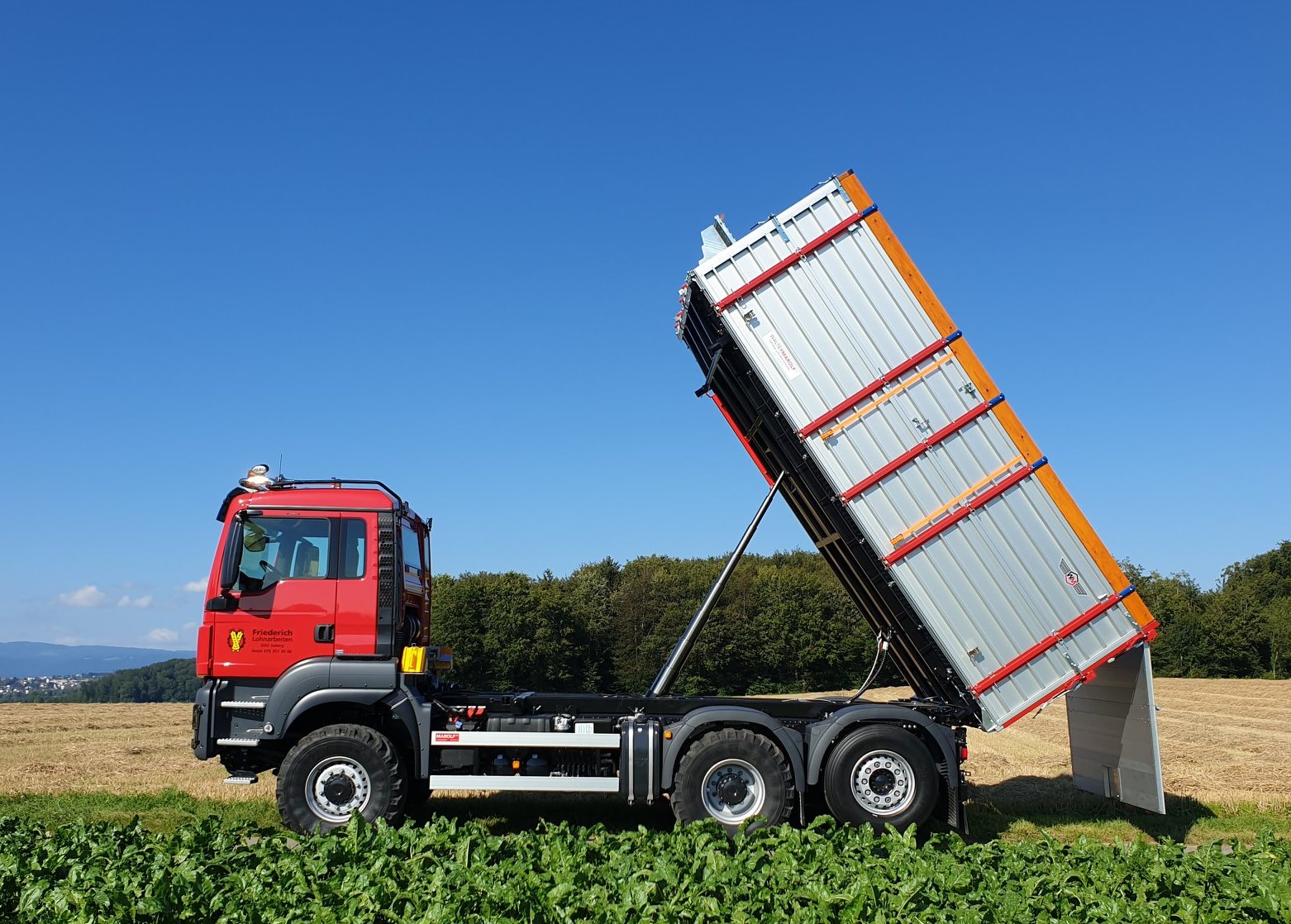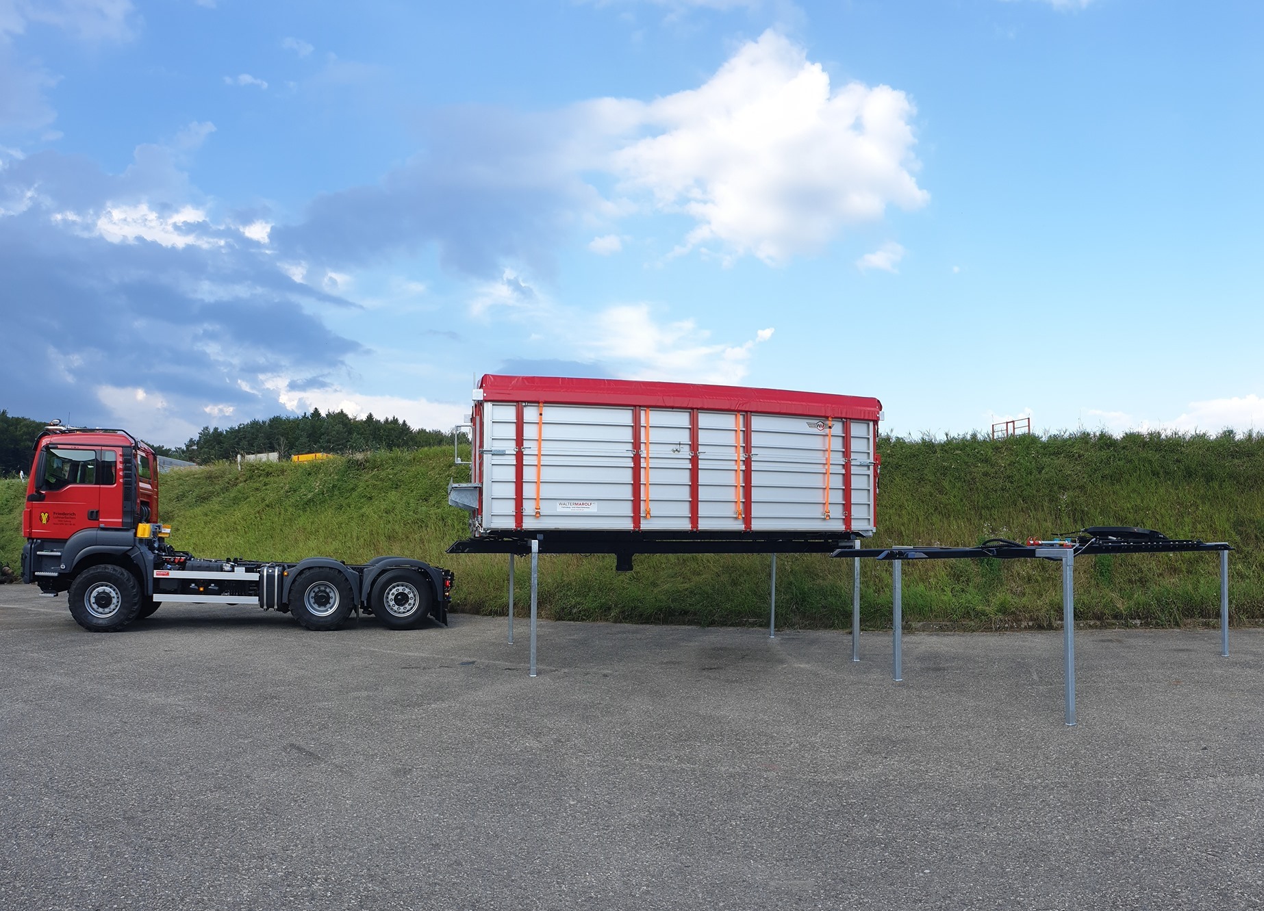 Необычное в этом автомобиле – это алюминиевый самосвальный кузов трехсторонней разгрузки, установленный швейцарской компанией Walter Marolf AG. Дело в том, что он сделан легкосъемным. Принцип установки его такой же как на кузовах BDF-типа: откидываются ножки-упоры, шасси опускается на пневмоподвеске и выезжает из-под кузова, стоящего на земле.