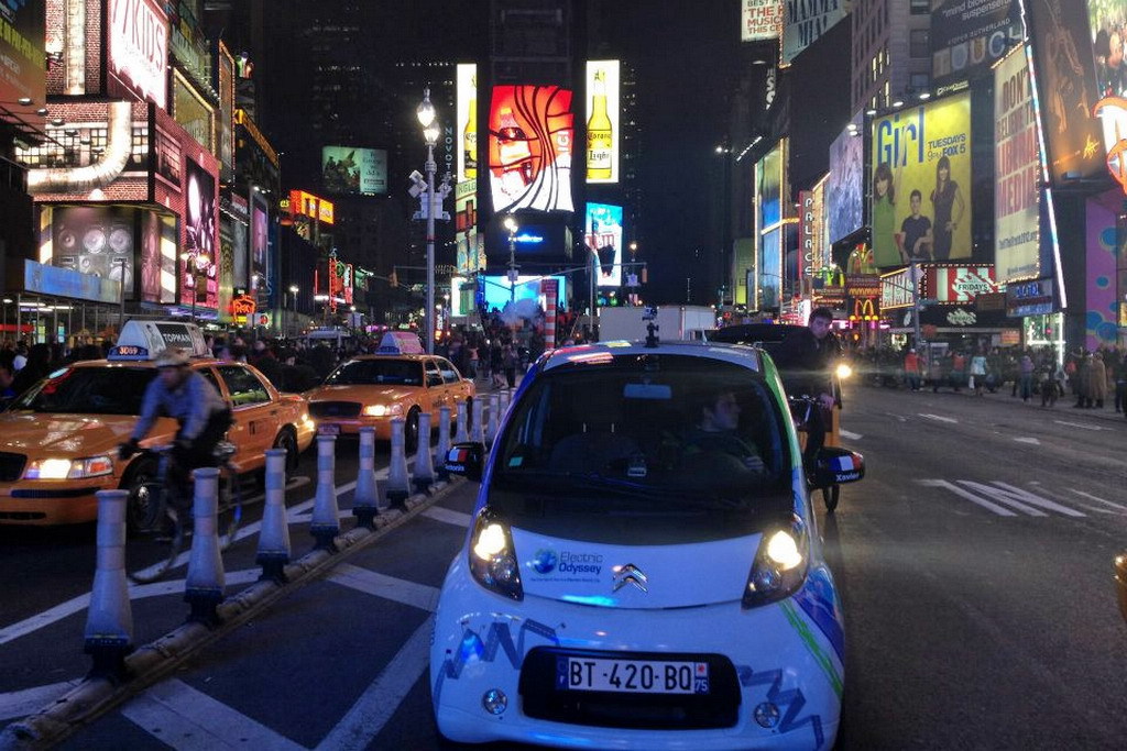 Две с половиной недели спустя, автомобиль, наконец, достиг берегов Америки, штат Нью – Йорк. Ребята возобновили путешествие, как только получили машину в порту Нью – Йорка и 17 марта уже были в Чикаго (Иллинойс). «Несмотря на то, что жители Америки водят в основном пик-апы, они довольно живо и позитивно реагируют на маленький электромобиль,» – отметил Ксавье Дегон. «Проблем с подзарядкой у нас нет, единственная сложность состоит в том, что стандартные розетки в Америке имеют мощность 110Вт вместо 220Вт в Европе, поэтому время подзарядки увеличилось с 6 до 14 часов, что заставило нас пересмотреть график зарядки батареи. Все жители нам охотно помогают и очень удивляются тому, что мы отважились пересечь Америку на автомобиле, которому требуется подзарядка каждые 120 км. А когда мы объясняем, что собираемся таким образом пересечь не только Соединенные Штаты, но и весь мир, американцы достают смартфоны и начинают нас фотографировать…», – рассказал Ксавье Дегон.