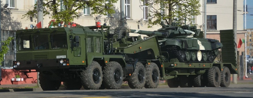 Впервые на публике - танковоз МЗКТ-741501-019 + МЗКТ-720100, созданный специально для белорусской армии. Грузоподъемность автопоезда — 52 т, мощность двигателя — 525 л.с. Прежде в гамме МЗКТ был похожий седельный тягач (МЗКТ-741500), но там мощность и грузоподъемность были несколько поменьше.