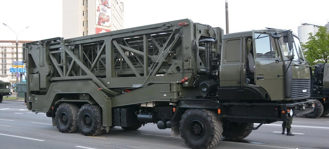 Эта машина была на прошлогоднем MILEX-2019, на параде впервые. Официальное название — антенная платформа мобильной твердотельной радиолокационной станции обнаружения маловысотных целей с кольцевой фазированной антенной решеткой (МРЛС) «Роса-М». Шасси — МЗКТ-652730-050.