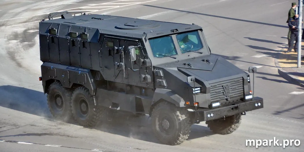 А вот новейший бронеавтомобиль под названием «Секач». Разработка ОКБ «ТСП». Главная идея — в возможности менять боевые модули, а шасси, по сути, оригинальное, но с использованием измененных МАЗовских элементов. Так, например, лонжероны рамы делались по образу и подобию МАЗовских, но по отдельному заказу. Карданы похожи на МАЗовские, но размер нестандартный. Мосты МАЗовские, но существенно доработанные.