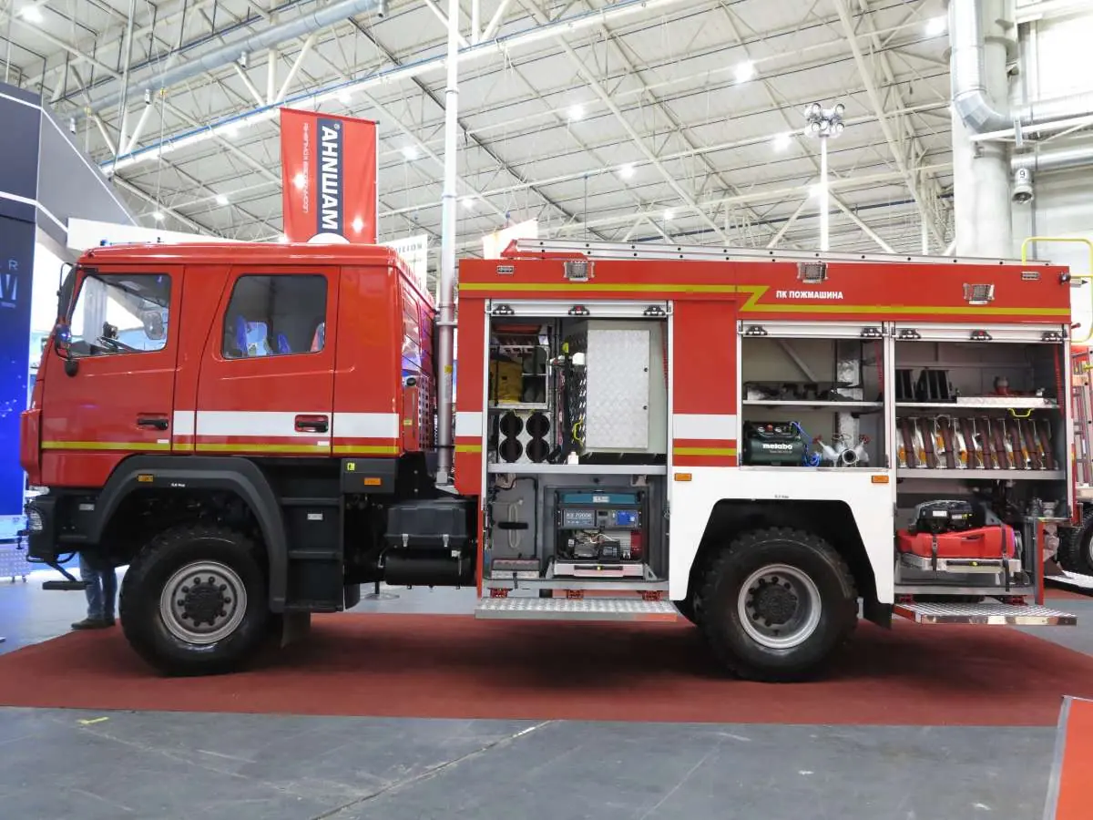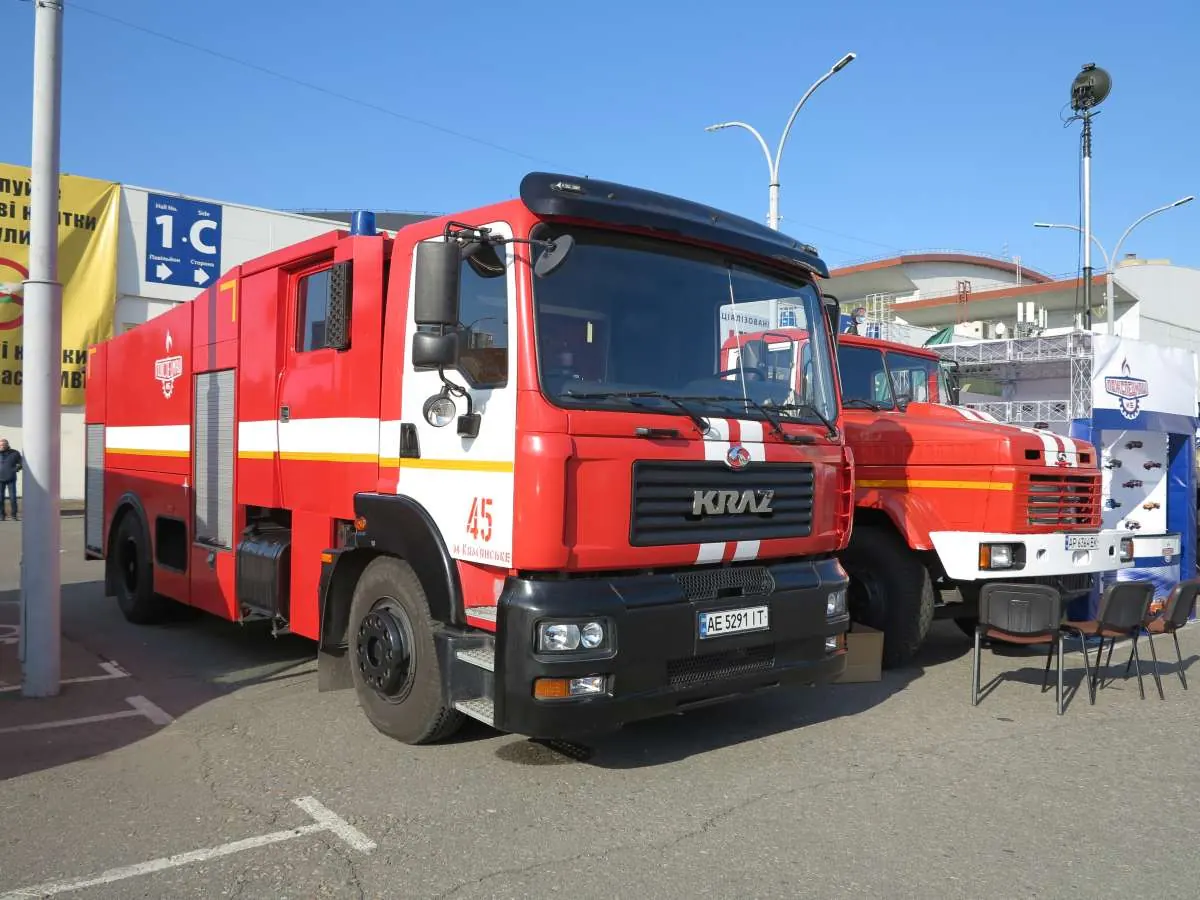 На улице можно также увидеть два пожарных автомобиля отечественного производителя КБ «Пожспецмаш». Внимание привлекает пожарная автоцистерна АЦ-40 (5401Н2)-712.11 на шасси КрАЗ-5401Н2 (4х2) с кабиной бескапотной компоновки. Турбодизель WP.300 (Евро 5) мощностью 300 л.с. Полная масса – 18 700 кг. Двухрядная кабина имеет 2+4 места боевого расчета. Максимальная скорость 100 км/ч.