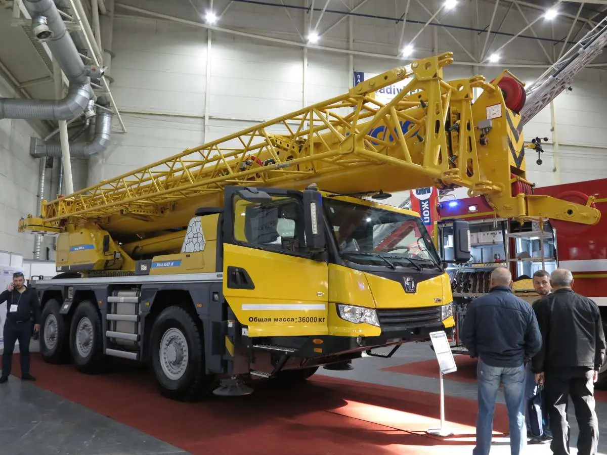 Неподалеку компания ООО «Техноэкспо» демонстрирует автокран китайского производства – XCMG XCA 60-E, грузоподъемностью 60 тонн. Длина полностью выдвинутой стрелы – 48 м, с гуськом – 64 м. Скорость работы: подъем стрелы – 38 с, телескопическое выдвижение – 310 с, максимальная скорость поворота – 2 об/мин.