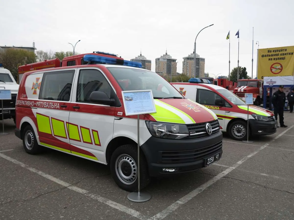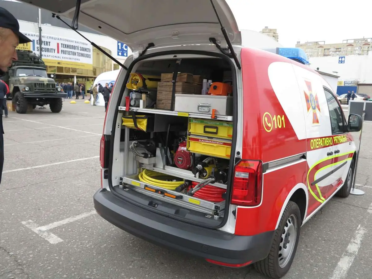 Рядом стоят специально аварийно-спасательный автомобиль легкого типа САРМ-Л на шасси фургончика Volkswagen Caddy и такая же машина на шасси Volkswagen T6. Оба автомобиля произведены компанией Wilhem Barth GmbH (Германия).
