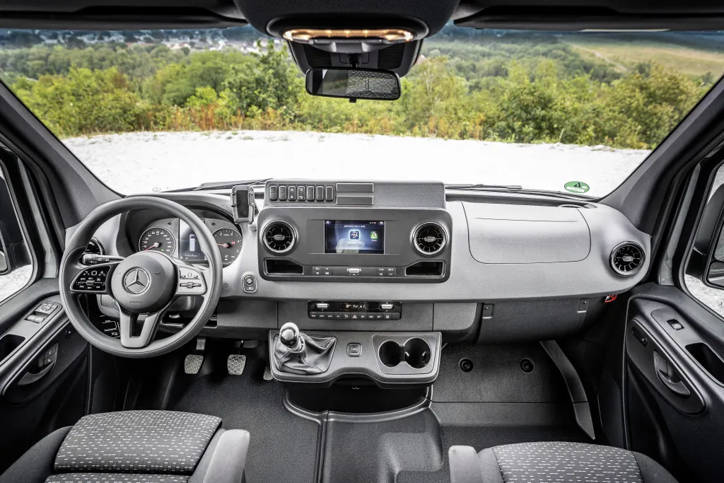 В кабине водителя тоже есть кондиционер, а также кресло повышенного комфорта. Процесс управления облегчает автоматическая коробка передач 7G-Tronic, работающая в паре со 143-сильным турбодизельным двигателем OM 651.
