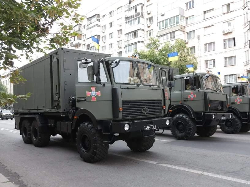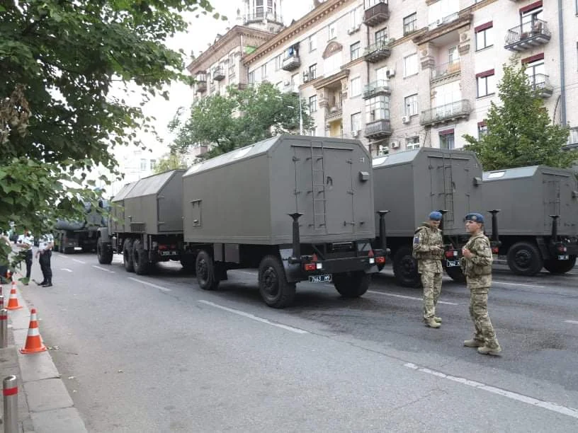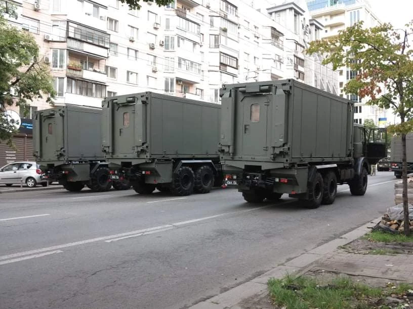На центральную площадь столицы выехала и техника Государственной службы специальной связи и защиты информации Украины. Это полевые комплексные аппаратные связи Д-14МУ, созданные предприятием «Київприлад» - на шасси МАЗ (4х4) с кузовами-фургонами от компании «Спецбудмаш».