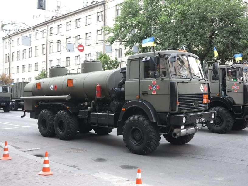 Демонстрировалась и специальная техника логистического обеспечения войск – это бронированные ремонтно-эвакуационные машины на базе БТР-4, транспортные тягачи и автоцистерны (топливозаправщики) на шасси МАЗ-6х6, а также мобильные банно-прачечные комплексы (на шасси МАЗ с прицепами), оборудованные для мойки личного состава и стирки личных вещей военнослужащих - именно в полевых условиях.