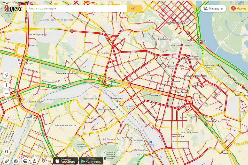 Согласно сервису «Яндекс.Пробки», на 16:30 вечера в Киеве зарегистрированы пробки на 8 баллов из 10 возможных. К шести часам, когда киевляне начнут ехать домой, город может полностью остановиться. Наибольшие тянучки зафиксированы в центре города. Также традиционно тянется улица Телиги – Московский проспект в сторону Троещины, подъезды к мостам, в районе Шулявки и Нивок в направлении Святошино.