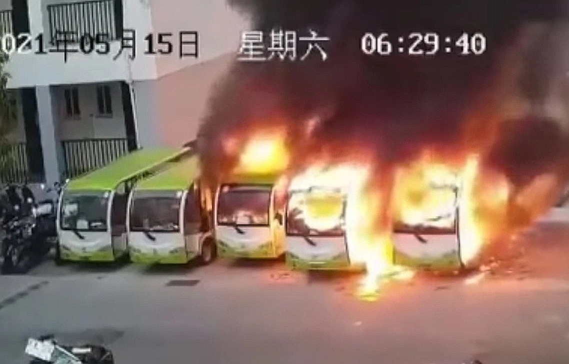 Возгорание электрического транспорта не такое уж редкое явления, однако бывают случаи из ряда вон выходящие. В одном китайском городе на стоянке воспламенились один за другим сразу шесть электрических автобусов. Если быть точным, то это открытые многоместные транспортные средства для экскурсионных поездок на небольшие расстояния.