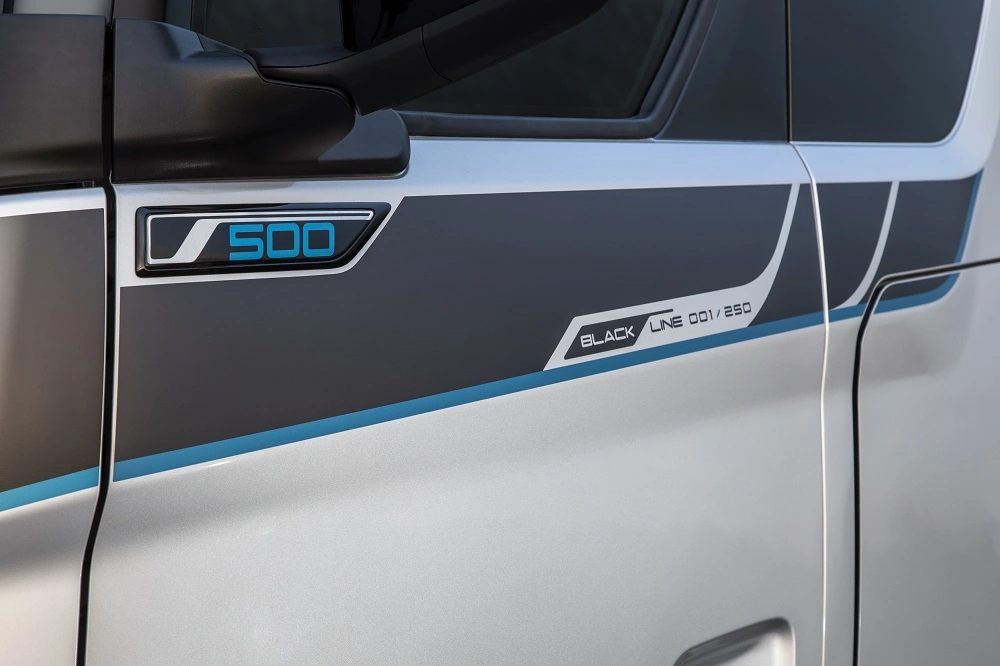 F-MAX Blackline – эксклюзивное исполнение международного грузовика года F-MAX, будет выпущен ограниченной серией. Каждый грузовик будет иметь специальный серийный номер и эмблему Blackline Series на двери. В рамках этой ограниченной серии будет выпущено всего 250 единиц, которые будут доступны в специальном серебристом цвете кузова ‘moondust’ с синими и черными полосами, подчеркивающими стиль автомобиля, а также с черными LED фарами, черными колесными дисками и черными корпусами боковых зеркал.