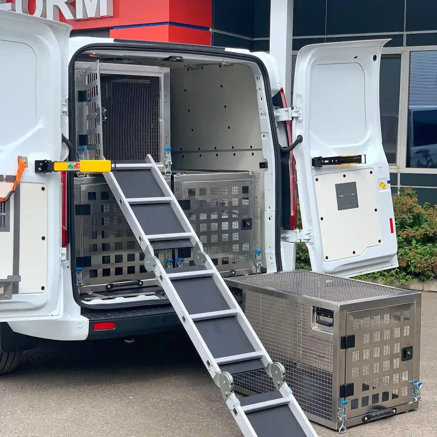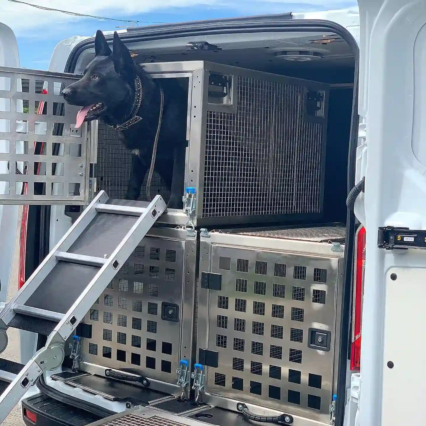 Имеется также раскладной трап-лесенка, по которому питомцы быстро спускаются или наоборот поднимаются в клетки второго яруса. В транспортном положении трап крепится к внутренней панели левой дверной створки. Так что такой кинологический автомобиль будет хорошим помощником для охранных структур, полицейских и пограничников.