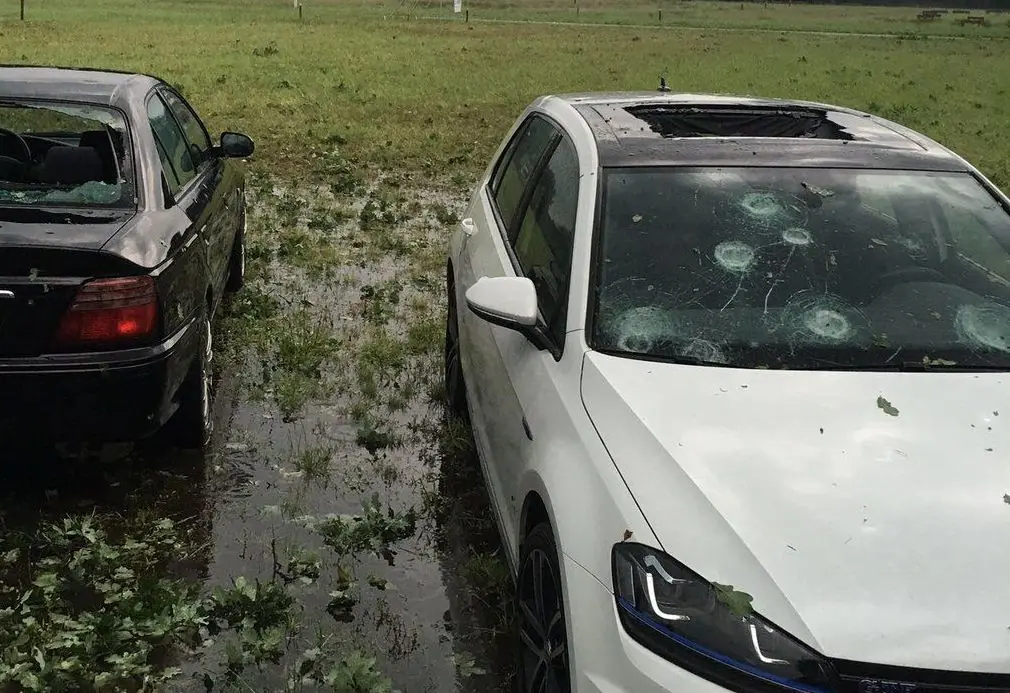 Больше всего пострадали автомобили, стоящие на открытых площадках - у домов, на парковках. Как можно видеть на фото, у машин оказались побиты, а в некоторых случаях даже пробиты кузова и стекла. Местами с неба падали шары льда, еле помещающиеся в ладонь!