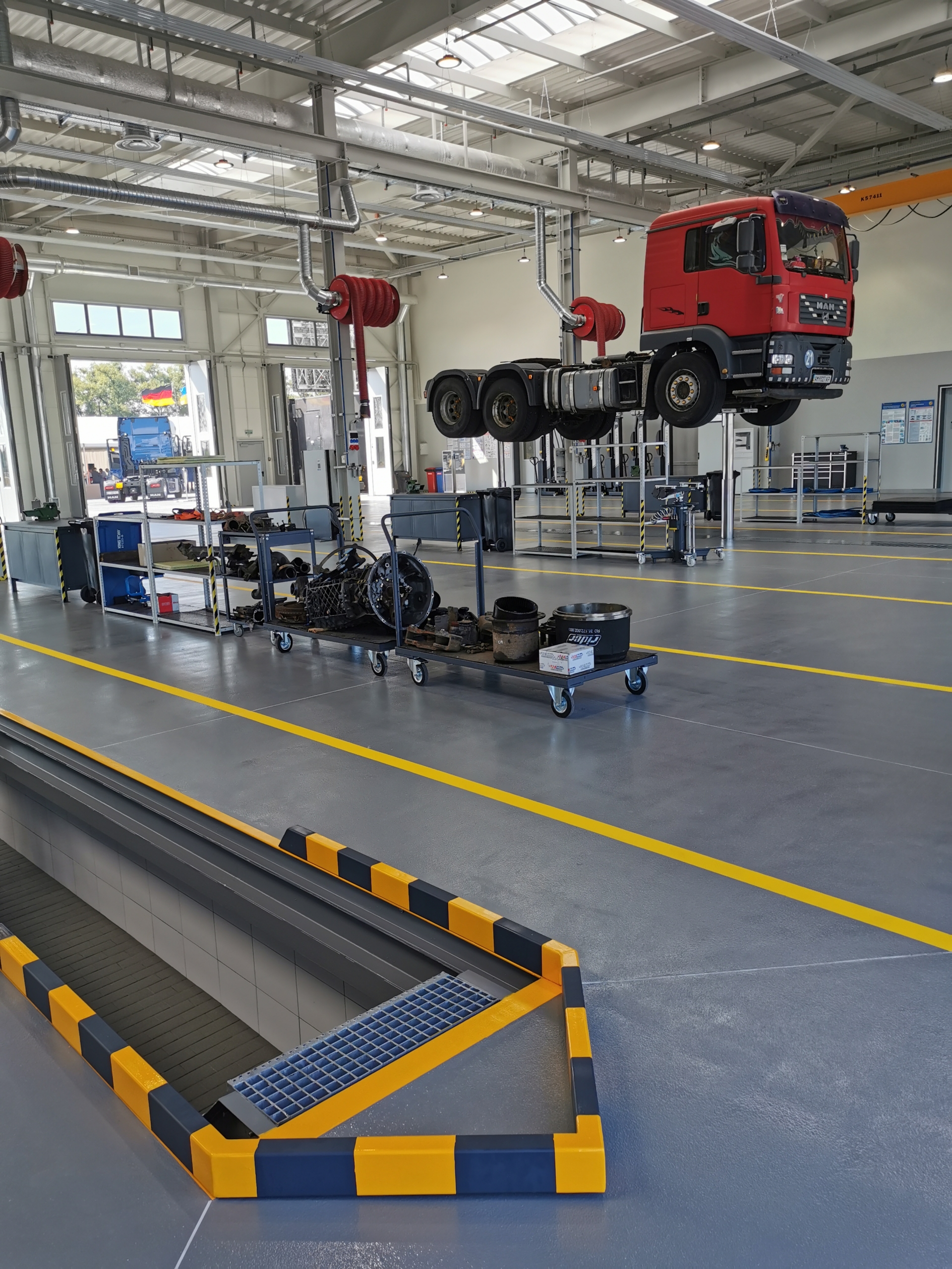 Новая авторизованная сервисная станция имеет три 25-метровые смотровые ямы, оборудованные пятью 16-тонными домкратами.