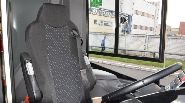 Новая дверь перегородки кабины “европейского” типа открывается в сторону салона – последний тренд в безопасности – дает возможность водителю быстро покинуть кабину в случае опасности. Предусмотрено стекло-экран с окошком для “обилечивания” пассажиров, плоская часть панели под установку кассы.