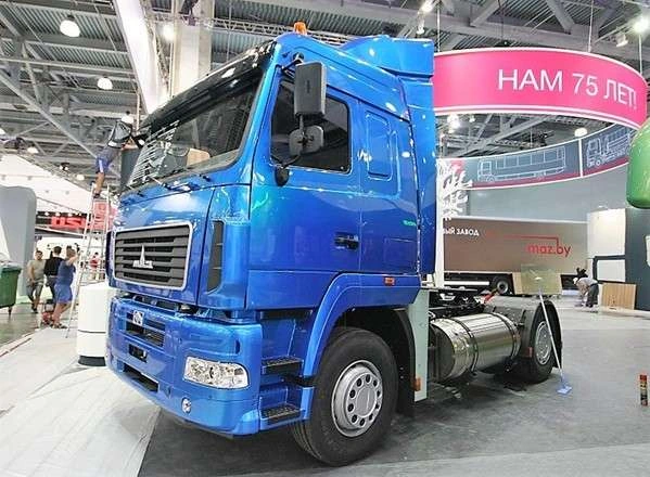 На выставочной площадке представлена модель 2019 года – седельный тягач МАЗ-54А02К, оснащенный газовым двигателем WP12NG 400E50, работающим на сжиженном природном газе (СПГ), мощностью 400 л.с. с крутящим моментом 1730 Нм. Автомобиль может проехать не менее 700 км – для этого в базе установлены два криогенных бака полезным суммарным объемом 755л (производства компании CHART: 405 л. справа и 350 л. слева) или 688 л. (производства компании CIMC).