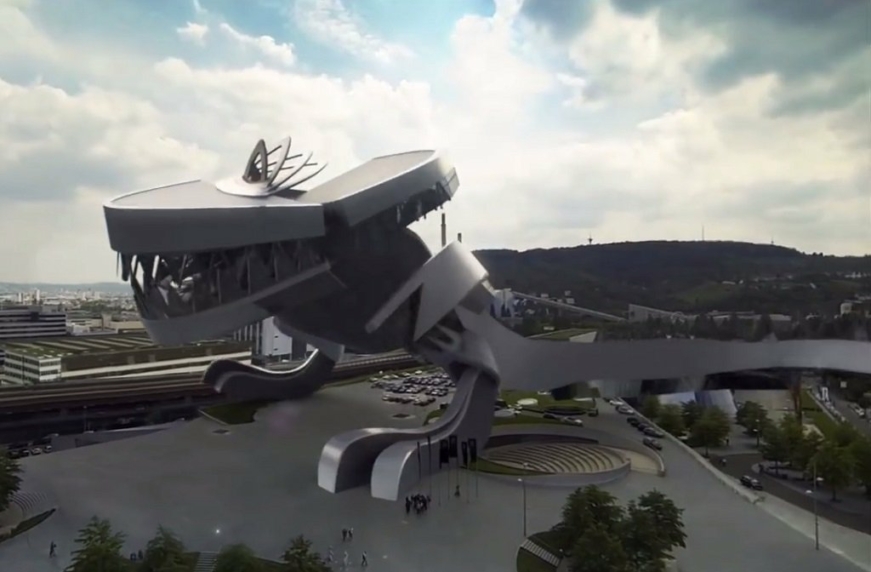 Первая победившая работа называется Hungry for history. В ней показан доисторический монстр, который охотится за ретро-автомобилями. Каждые несколько секунд он съедает по одной машине, начиная с трехколесного первенца Benz 1886 года и заканчивая родстером SL 70-х гг. В итоге страшная голова хищника перевоплощается в модерное здание нынешнего музея, выполненного в стиле спирали.