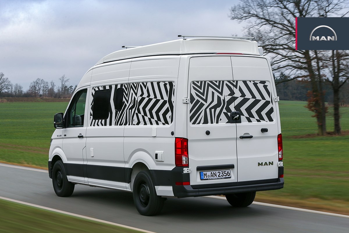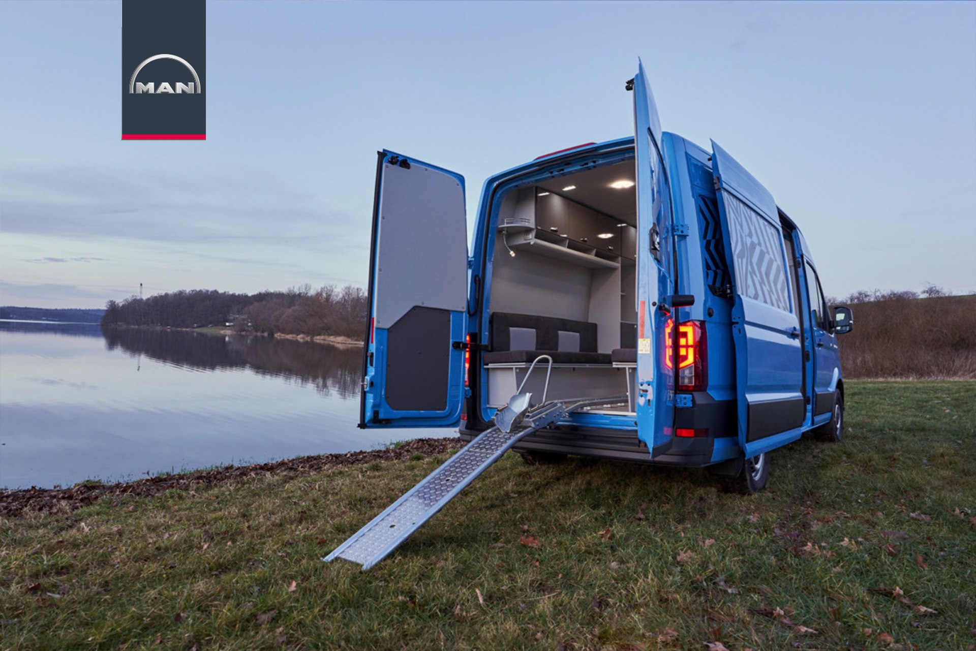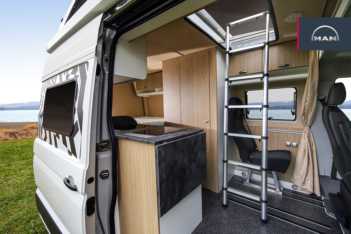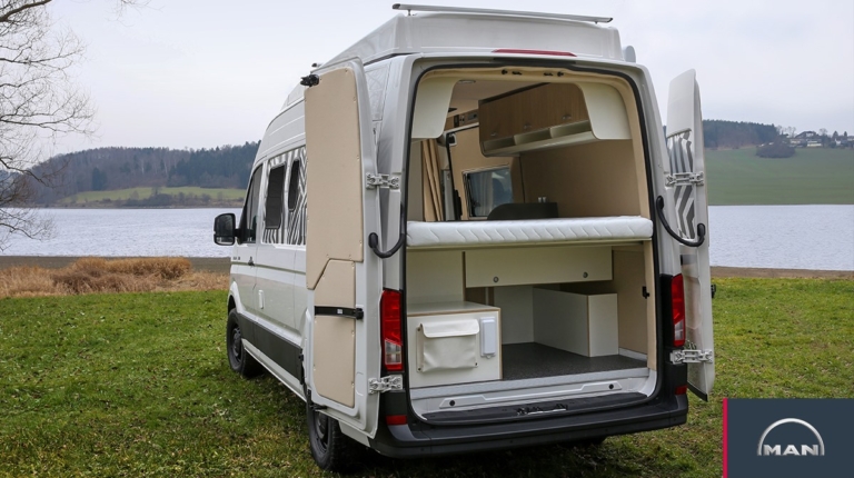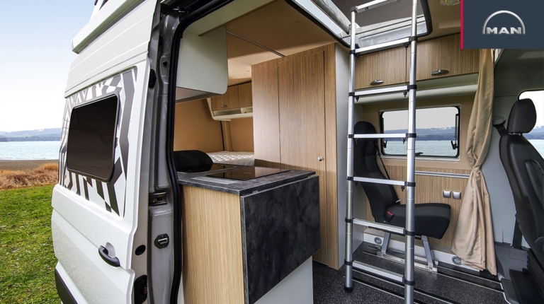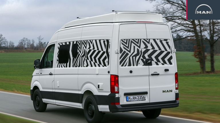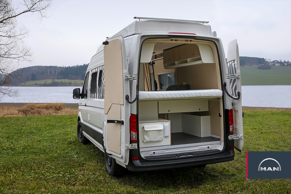 Начнем с MAN TGE 4×4 в черно-белом окрасе – кемпера для двух путешественников. Компания Bus Modification Center (ВМС) учла все необходимое, установив на машину спальню, кухонный блок, душевую кабину и даже подъемную крышу, которая трансформируется в палатку.