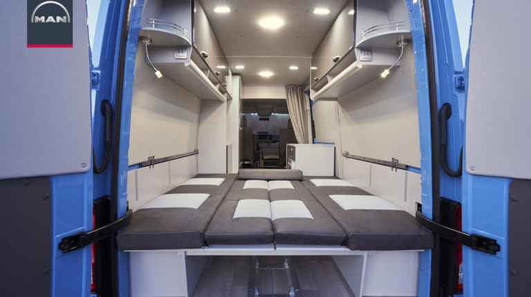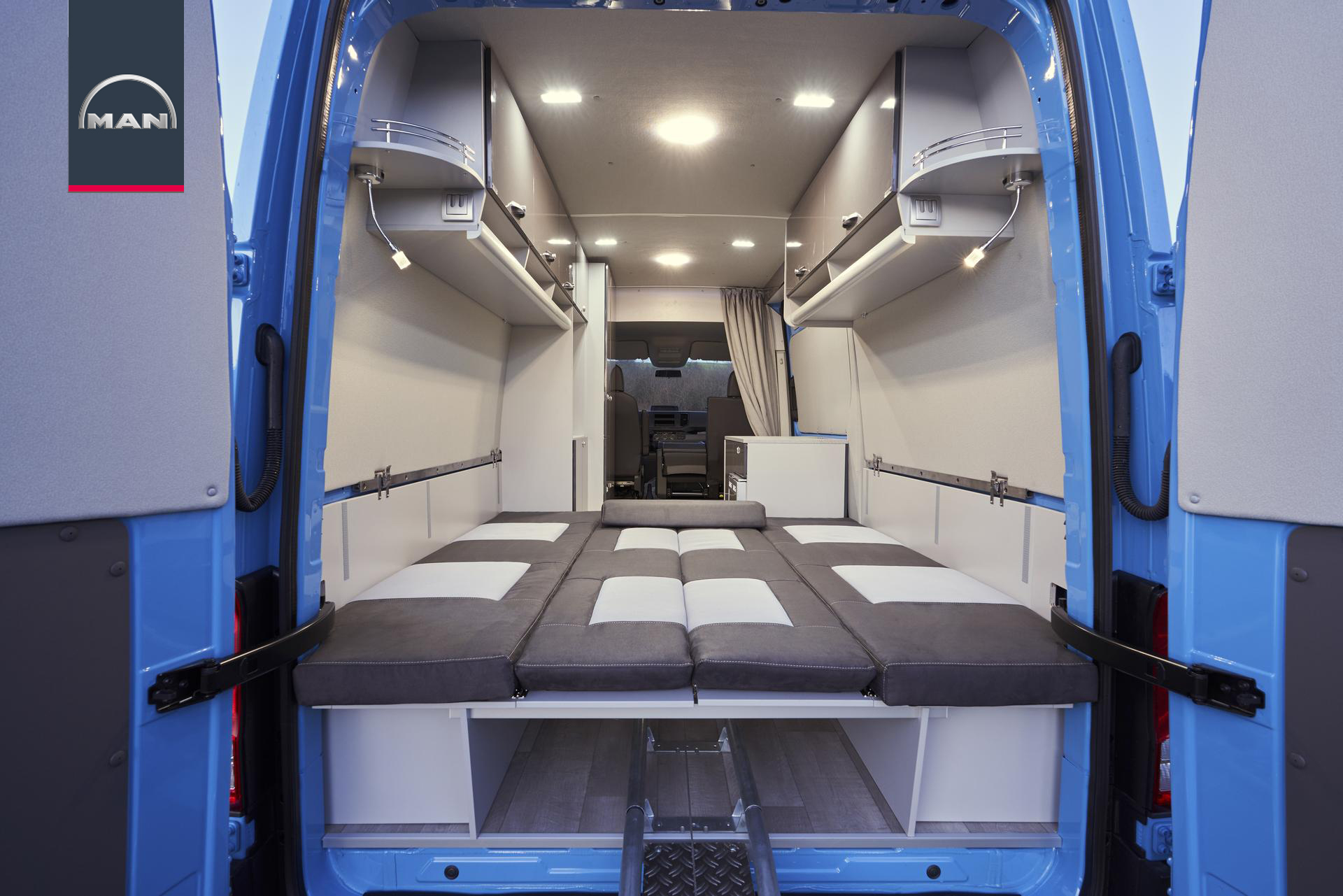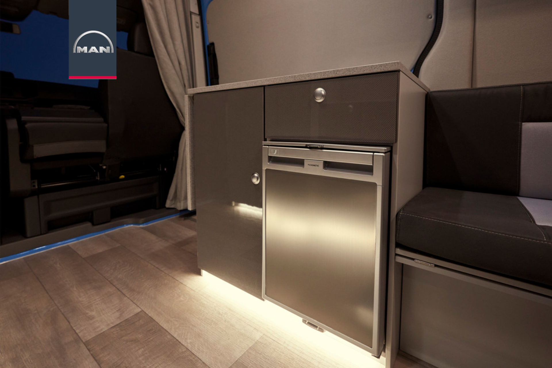 Однако ВМС не остановилась на достигнутом и презентовала еще один вариант для ценителей активного отдыха. Этот кемпер также сделан на базе полноприводного MAN TGE и укомплектован, как и первая машина, турбодизелем мощностью 177 л.с. Отличительной чертой является салон. По желанию владелец транспорта может менять планировку салона, ведь все мебельные блоки являются подвижными.