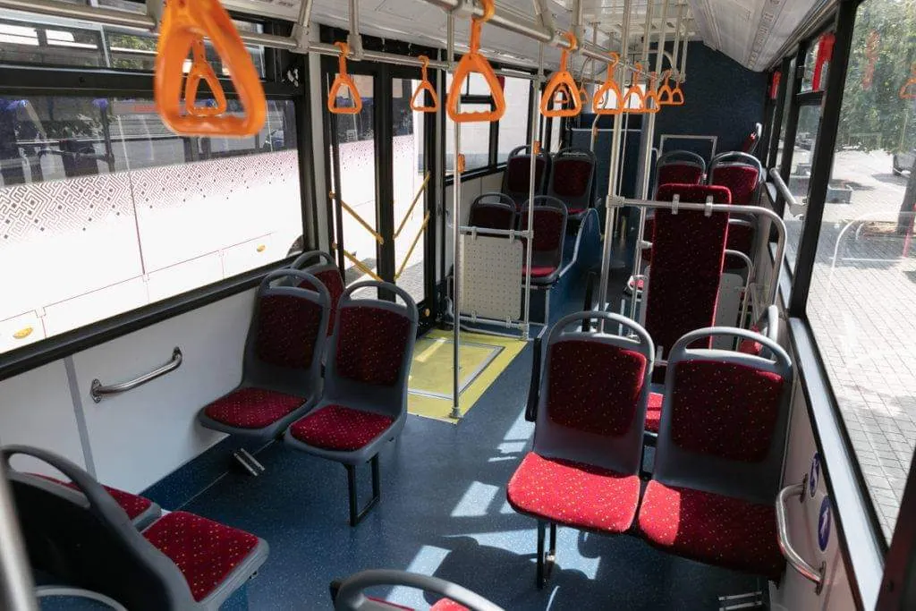 Салон рассчитан на 104 пассажира, мест для сидения 29. Как видно по фото, автобус приспособлен для перевозки людей с ограниченными физическими возможностями - здесь есть откидной пандус и площадка в салоне для фиксации инвалидной коляски.