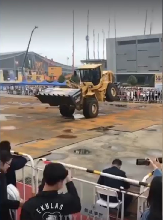 А вот следующий трюк выполняет уже тяжелый фронтальный погрузчик, который с балластом в ковше филигранно балансирует на передних колесах, подняв задние колеса.