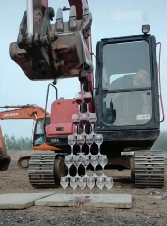 Также не оставляют равнодушными последующие цирковые номера на гусеничном экскаваторе, на которых ковшом ставится пирамида из бокалов, а затем все они наполняются вином из того же ковша.