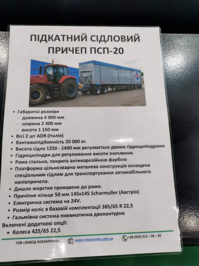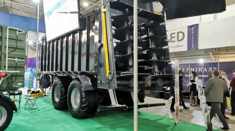 Обзор прицепной техники с выставки «ИнтерАгро 2020», которая проходит в столичном МВЦ с 28 по 30 октября, начнем с отечественного производителя – «Завод Кобзаренко». На стенде предприятия можно увидеть немало интересной продукции, но главной новинкой здесь является самосвальный полуприцеп-зерновоз DL-НПС 3250. Он имеет массу 7 т и грузоподъемность 32 т. Объем кузова составляет 50 кубометров. Габаритные размеры: 10,4х2,55х3,7 м.