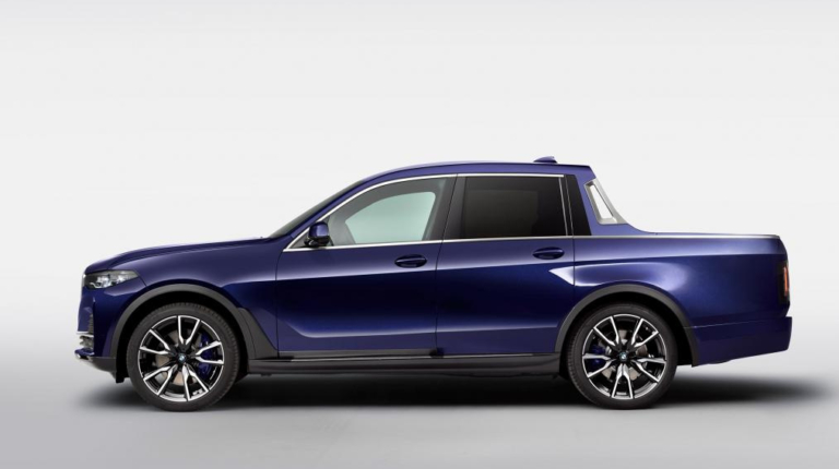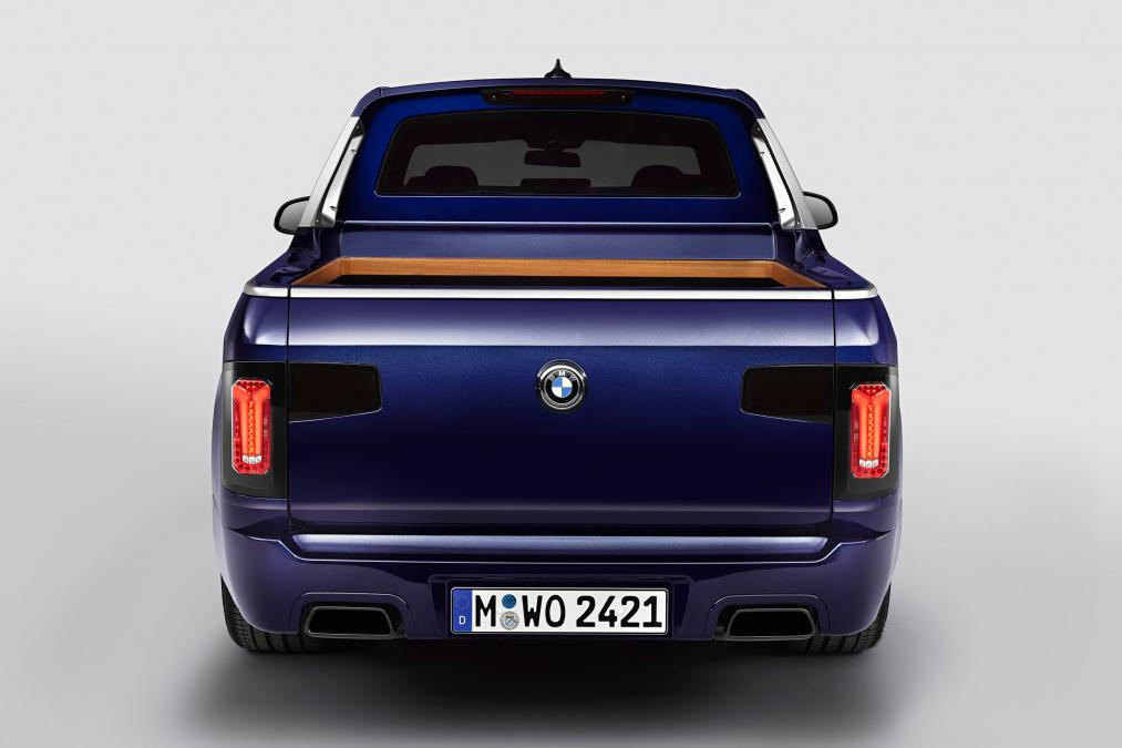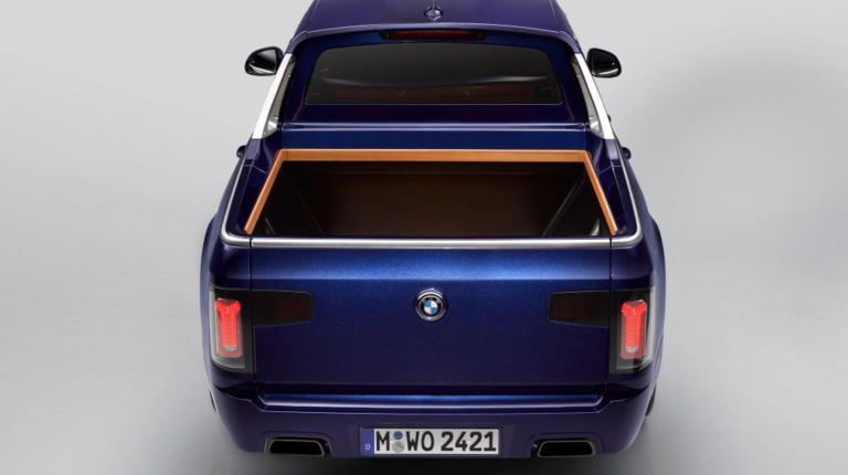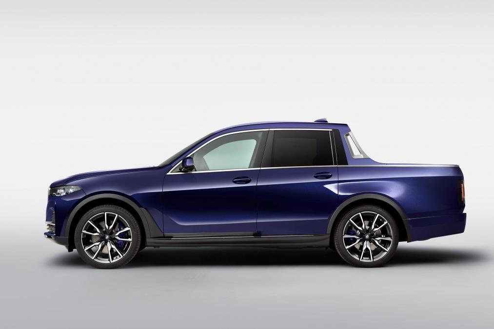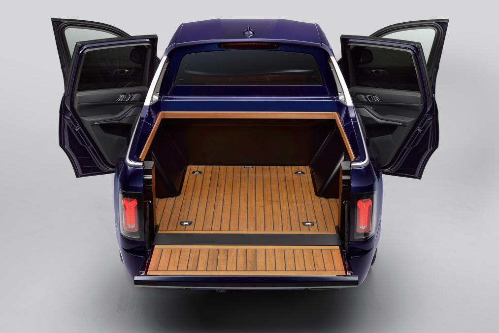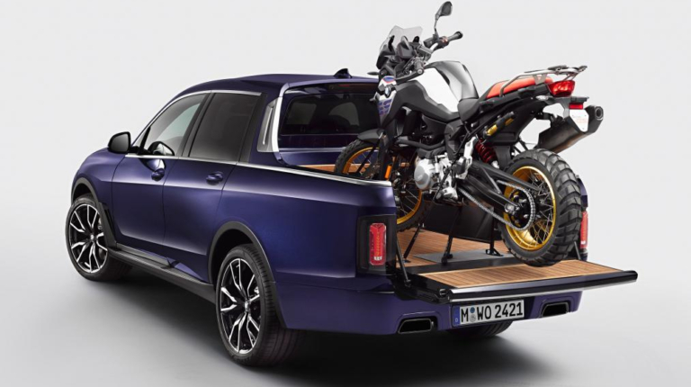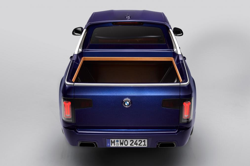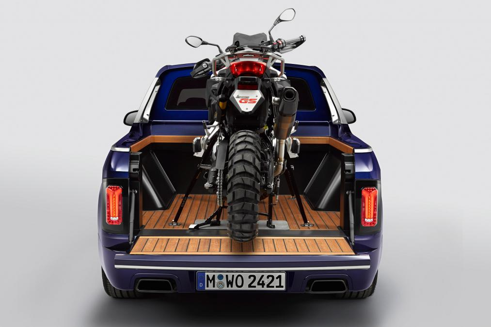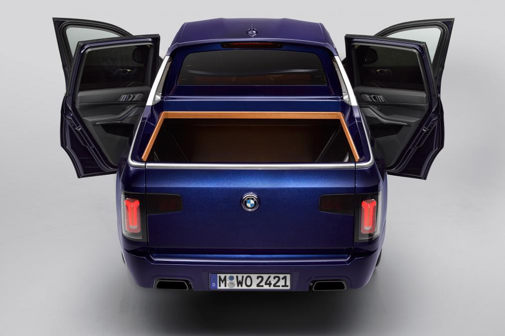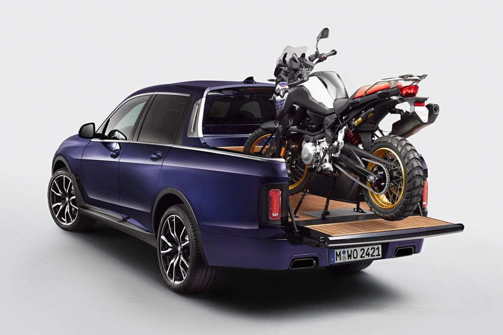 Пикап получил грузовую платформу длиной 200 см (с поднятым бортом – 140 см), на которую без проблем помещается мотоцикл класса эндуро BMW F850 GS. В конструкции использован углепластик, что позволило облегчить машину на 200 кг. По сравнению с серийным кроссовером X7 автомобиль стал длиннее на 10 см. Интересная деталь – ручки на задних стойках изготовлены на 3D-принтере.