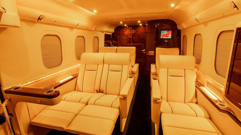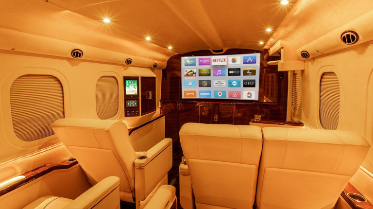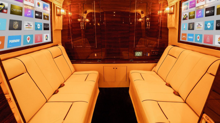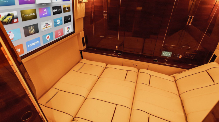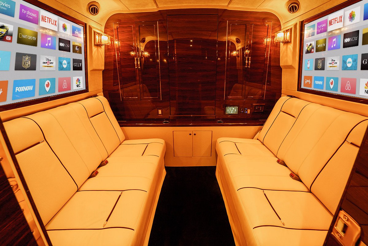 Эксклюзивный салон просто завораживает своим богатством. Планировка весьма оригинальная. Пассажирский отсек напоминает салон роскошного самолета – – как никак название Sky Master обязывает. Здесь шесть роскошных кожаных кресел с подогревом, массажем и электрически выдвигаемыми держателями для ног. На передней стенке кабины размещен громадный 65-дюймовый телевизор Curved Ultra HD TV. Боковые окна изнутри оформлены.