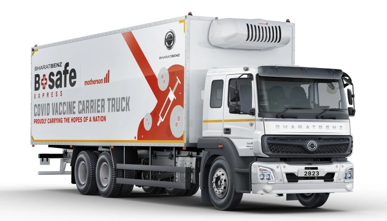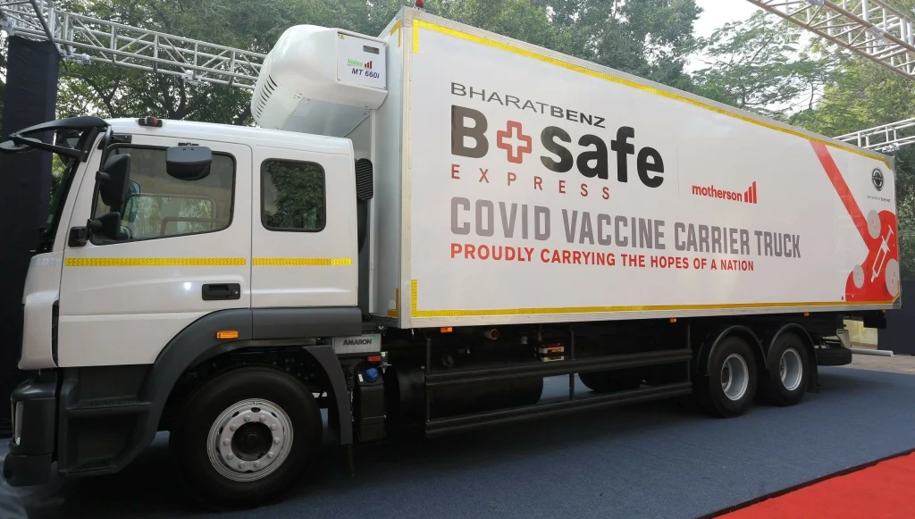 В паре с телематической платформой BharatBenz "Truckonnect" BSafe Express гарантирует дистрибьюторам вакцины максимальную безопасность - с отслеживанием в реальном времени как транспортного средства, так и его драгоценного груза.