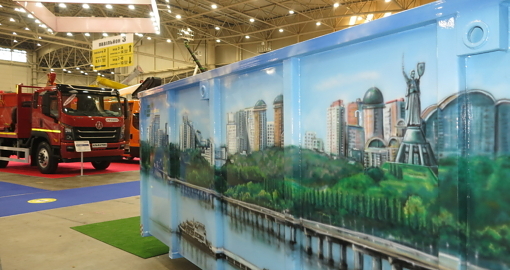 B заключение хочется рассказать о довольно яркой продукции компании «Экосервис Груп». В ее экспозиции можно было увидеть контейнеры типа «мультилифт», расписанные профессиональными аэрографами. Один кузов был оформлен под город в лучах заката, а на втором изображен правый берег Киева с основными архитектурными достопримечательностями и, конечно же, Днепром с пароходами.
