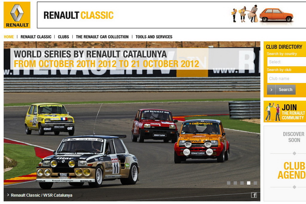С 3 октября во всемирной сети начал свою работу сайт www.renaultclassic.com исторического подразделения Renault. Он адресован всем любителям французской марки, которые интересуются историей компании, и ее классическими моделями. Кроме того, она позволит скоординировать активность компании и многочисленных клубов почитателей брендов Renault и Alpine. Новый веб-сайт будет знакомить посетителей с деятельностью отделения Renault Classic, а также информировать о новостях и предстоящих событиях. Он также позволит размещать на своих страницах разнообразную клубную информацию фанов Renault по всему миру, календари событий и мероприятий.