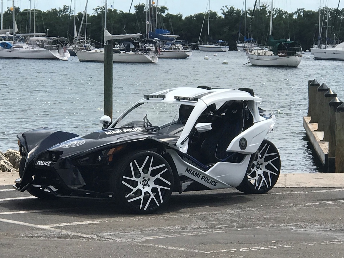 На службе у полицейского департамента города Майами появилось, вероятно, самое необычное в мире транспортное средство – трицикл Polaris Slingshot, который был пожертвован стражам порядка одной частной компанией.