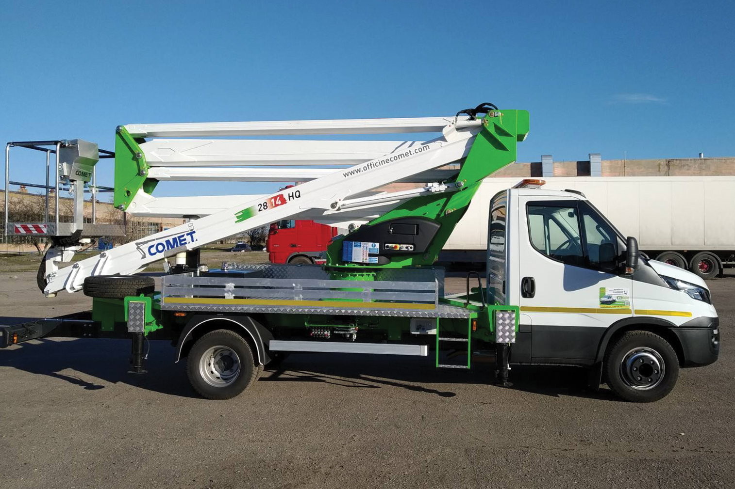 Автоподъемник Comet 28/2/14 HQ имеет максимальную рабочую высоту 28 м с максимальным вылетом 14 м. Безопасная рабочая нагрузка – 250 кг. Вращение наземной части – на 360 град. Контроль с пропорциональной гидравлической системой, работающей при низком давлении (всего 25 бар), обеспечивает плавное и точное перемещение трубки. Сама трубка алюминиевая, однако в качестве опции возможна поставка высокоизолированной, из стекловолокна, от случайных контактов с ЛЭП до 130 тыс. В.