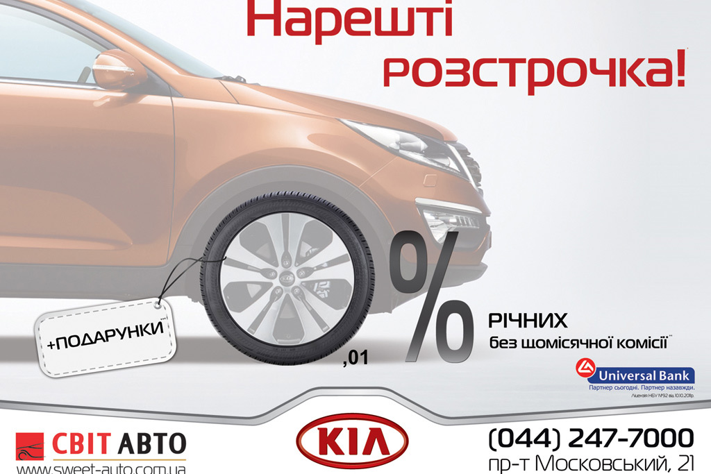 * Подразумевается кредит. Кредитует «Universal Bank» Лицензия НБУ № 92 от 10.10.2011 года** Процентная ставка 0,01%, срок кредитования 1 год, первый взнос – 60%, единоразовая комиссия 3%, график погашения аннуитет, без учета обязательных государственных регистрационных сборов, нотариальных услуг и страховых платежей. *** Под подарком подразумевается право приобретения дополнительного оборудования за 1 грн. с НДС. Детали акции смотрите на сайте www.sweet-auto.com.ua