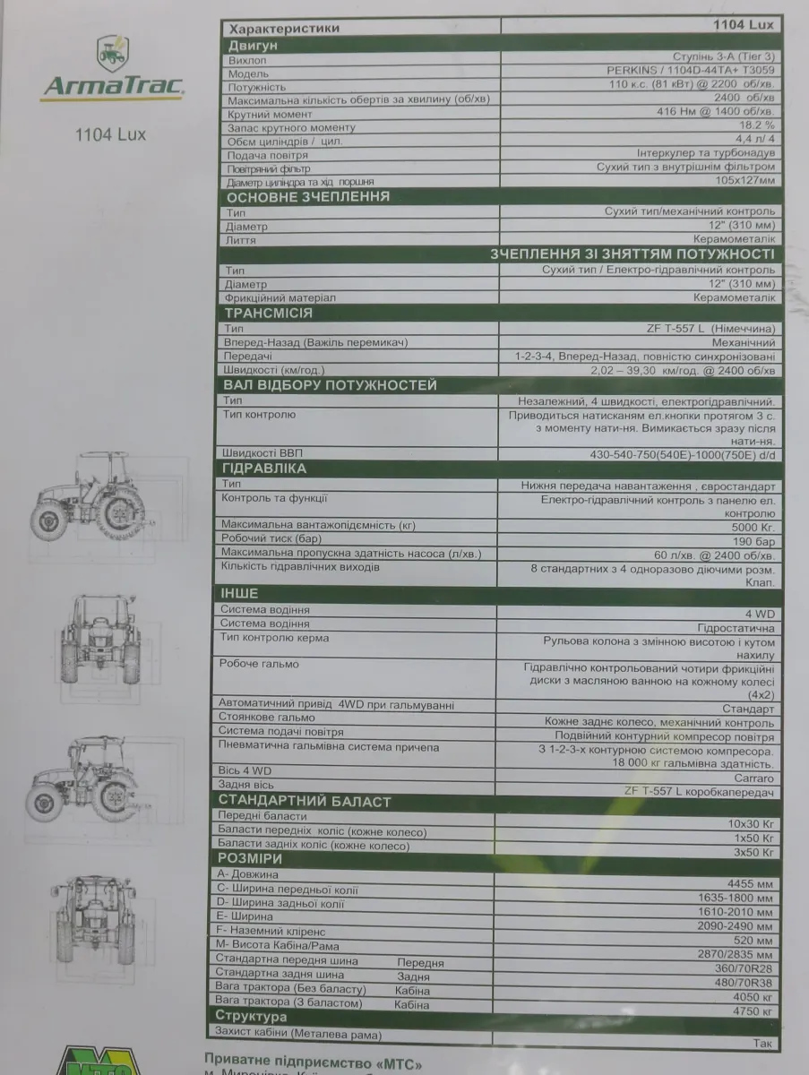 В Украине ArmaTrac представляет пять основных моделей. Это 110-й – т. е. мощностью 110 л.с. Особенность его в том, что он имеет полуавтоматическую коробку передач. Затем идет более дешевая, бюджетная модель – 105-я. Здесь механическая коробка передач итальянской марки Carraro. Двигатель – оригинальный, английской марки Perkins. Представляем также модели мощностью 85 и 50 л.с.