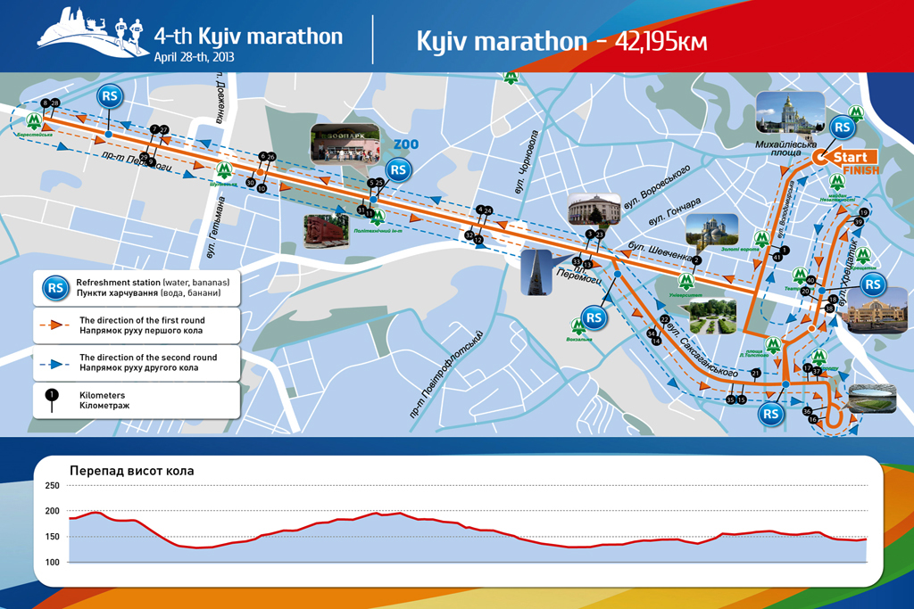 Киевский международный марафон, который уже в четвертый раз будет принимать у себя столица Украины, стартует в 9 утра 28 апреля и пройдет по маршруту от Михайловской площади по улице Владимирская, бульвару Тараса Шевченко, проспекту Победы до станции метро «Берестейская» и обратно до площади Победы, после чего свернет на улицы Саксаганского и Красноармейскую и через Крещатик с разворотом на Европейской площади возвращается на Владимирскую улицу и Михайловскую площадь. Соответственно, по всем перечисленным городским артериям, а также на подъездах к ним, движение транспорта будет перекрыто или ограничено.