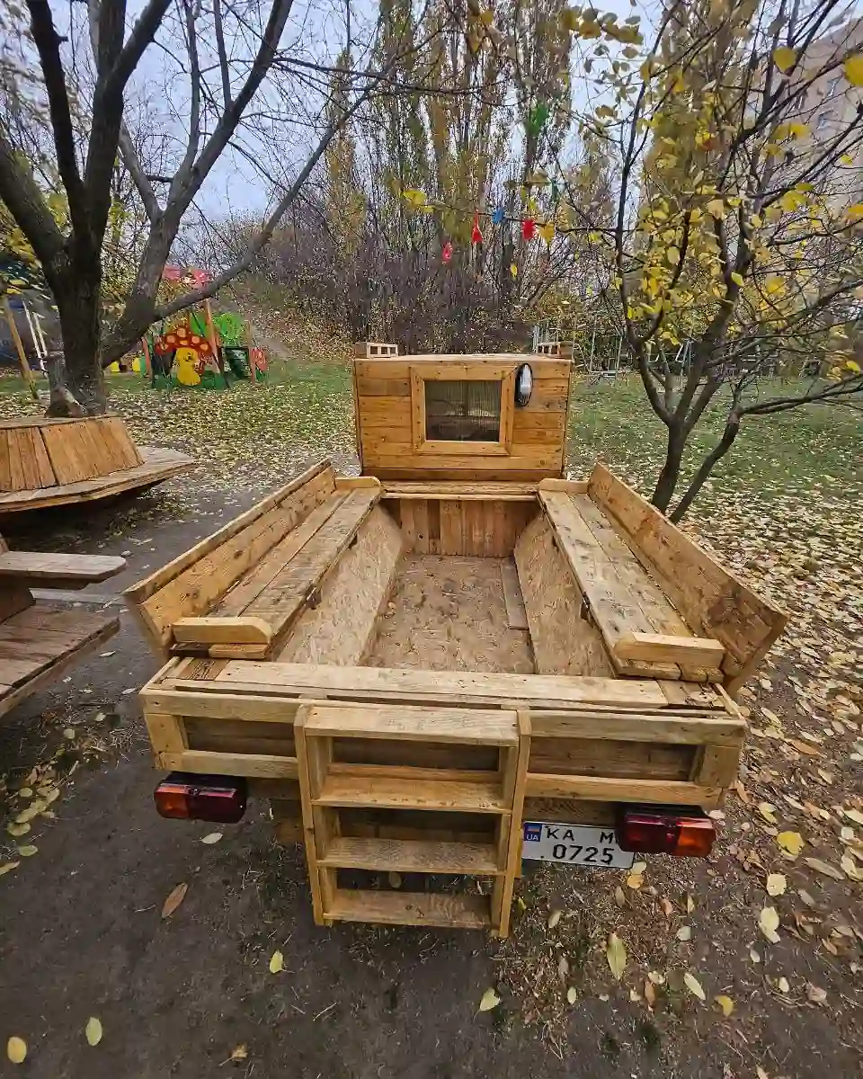 Этот диковинный автомобиль можно увидеть в Киеве, во дворе по улице Дачной, 53, что в Соломенском районе, сообщает Los Solomas Kyiv. Перед вами уникальный трехосный пикап Brabus XLP Adventure (6х6) на базе Mercedes-Benz Gelandewagen, построенный из использованных паллетов жильцами соседних домов. Машина, установленная на детской площадке, сразу же привлекает внимания уникальной деталировкой, которая не свойственна таким инсталляциям.