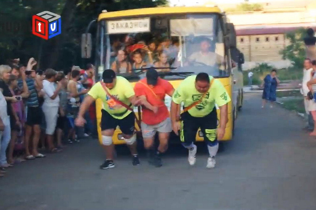 В конце праздника мариупольские силачи установили новый рекорд, протащив два автобуса с детьми больше 50 метров. Как отмечает чемпион Украины по пауэрлифтингу Евгений Гаврилин, это не последний рекорд, который хотят установить мариупольские силачи. «Первый рекорд, который мы устанавливали с Александром Лашиным – один автобус, в котором было 83 ребенка. Сейчас же у нас получилось в общем количестве 127 человек, которые находились в двух автобусах типа Богдан. Мы их протянули больше 50 метров», – говорит Евгений Гаврилин.