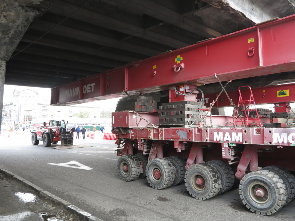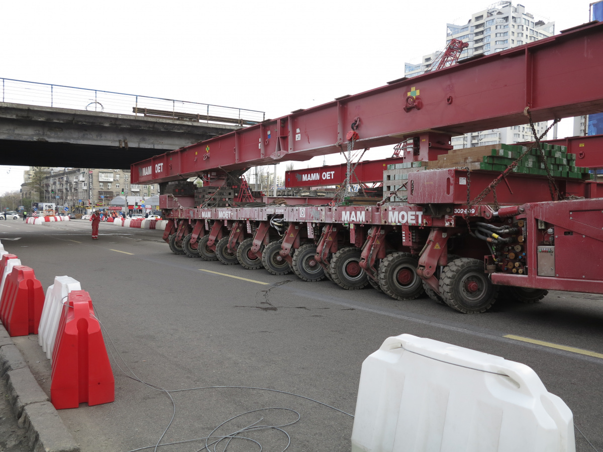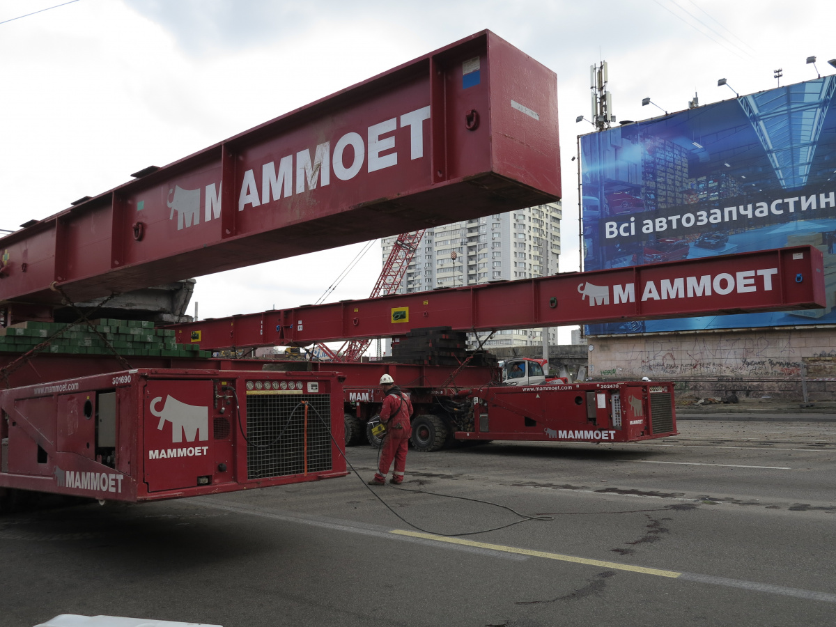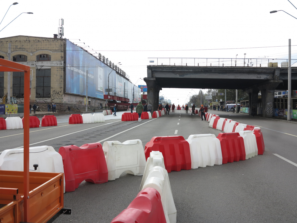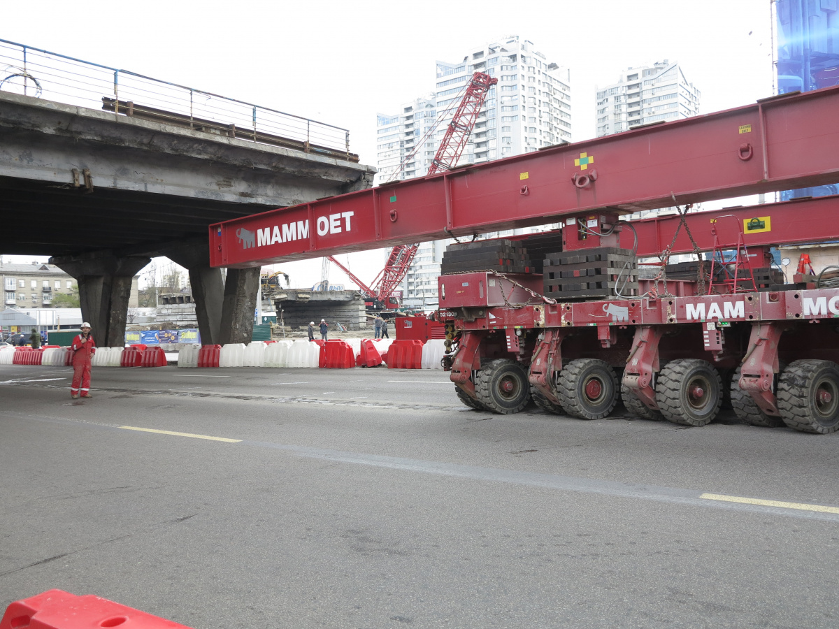 Мы уже писали о том, что Шулявский мост начали активно разбирать ровно месяц назад – 17 марта. Для этого задействовали гигантский 600-тонный гусеничный кран Liebherr. Затем принялись демонтировать пролеты, для чего был привезен из Нидерландов огромный колесный домкрат. И 17 апреля можно было наблюдать за его работой. Для этого полицейские перекрыли проспект Победы, точнее одну его сторону со стороны метро Шулявская и пустили оба потока машин по противоположной стороне, разделив их пластиковыми барьерами.