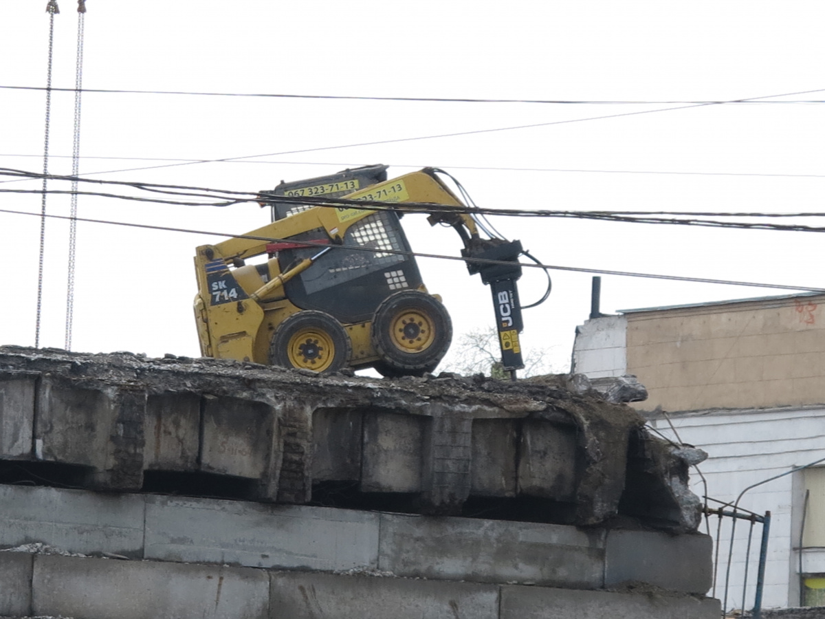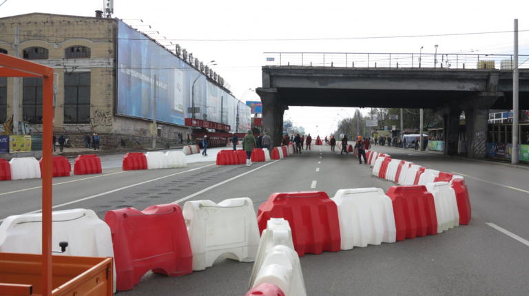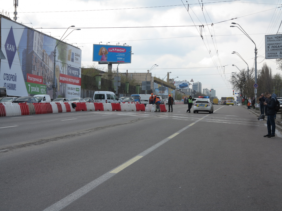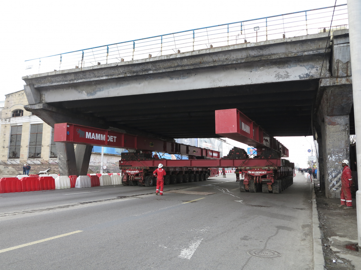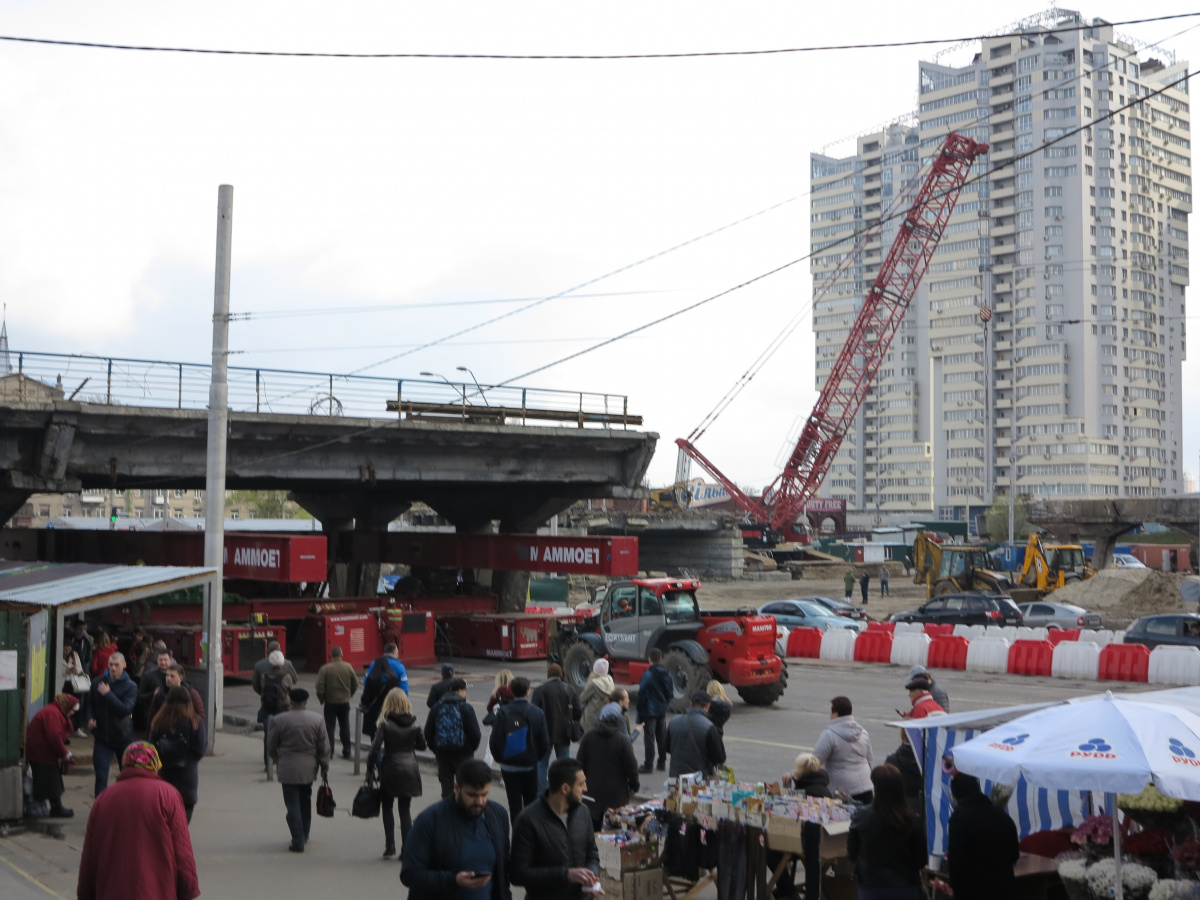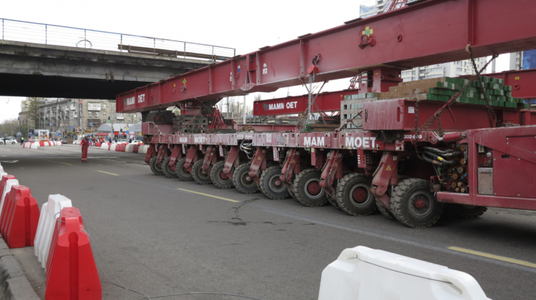 Мы уже писали о том, что Шулявский мост начали активно разбирать ровно месяц назад – 17 марта. Для этого задействовали гигантский 600-тонный гусеничный кран Liebherr. Затем принялись демонтировать пролеты, для чего был привезен из Нидерландов огромный колесный домкрат. И 17 апреля можно было наблюдать за его работой. Для этого полицейские перекрыли проспект Победы, точнее одну его сторону со стороны метро Шулявская и пустили оба потока машин по противоположной стороне, разделив их пластиковыми барьерами.