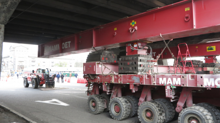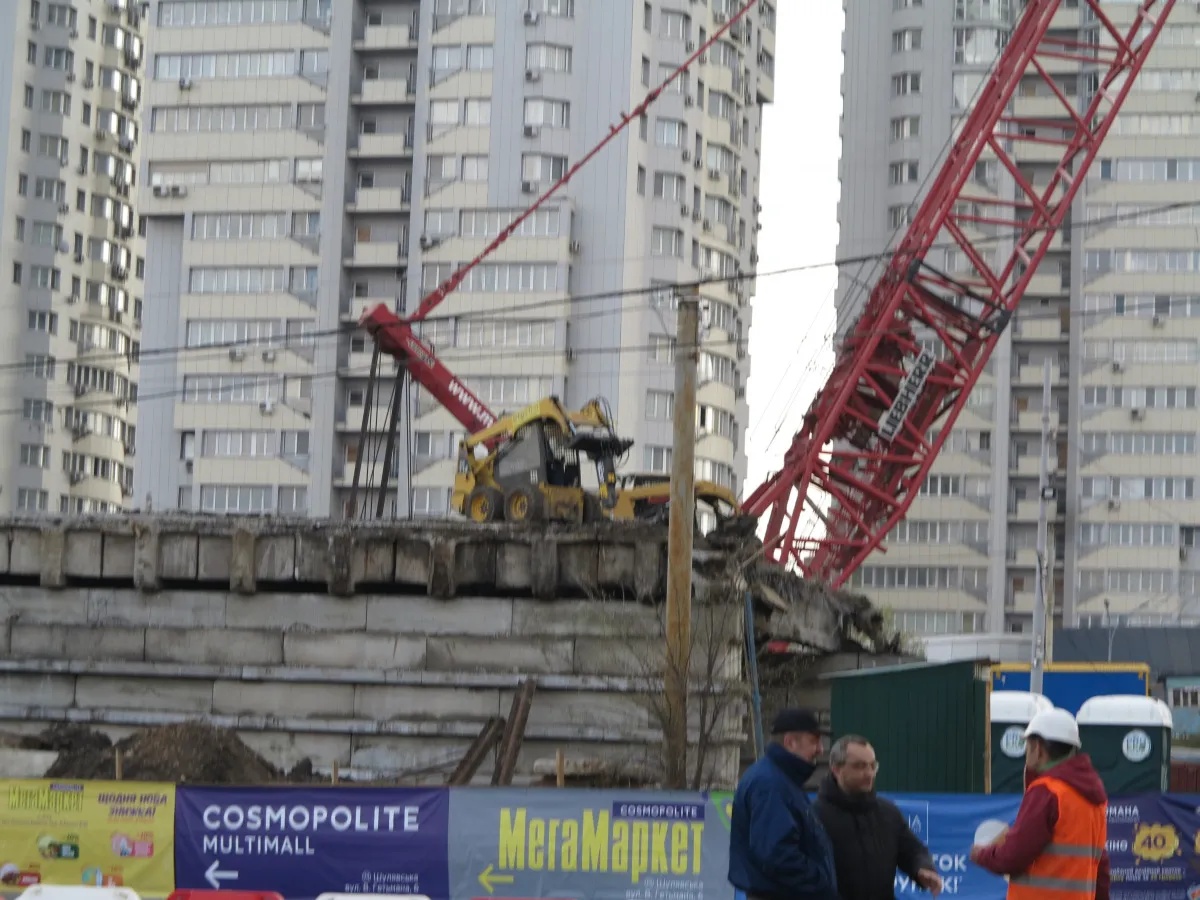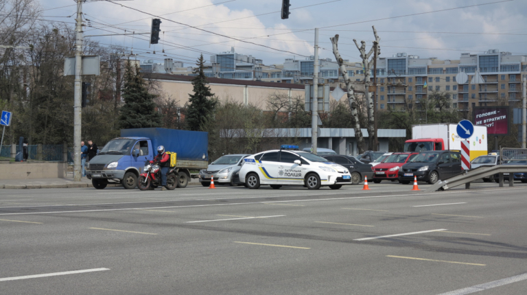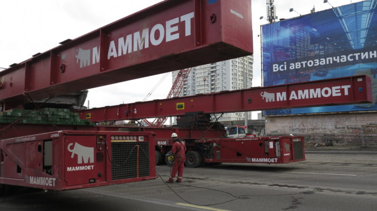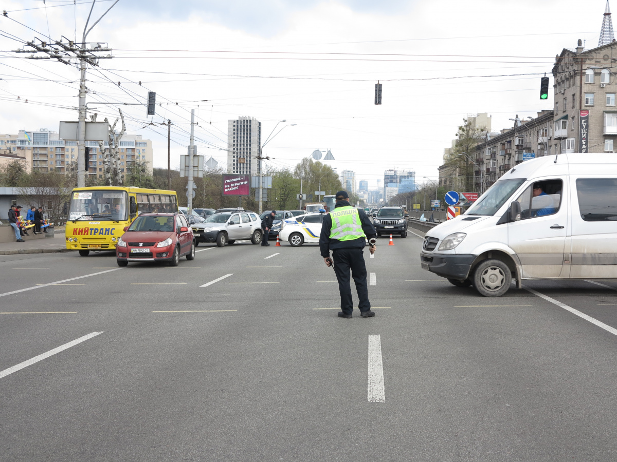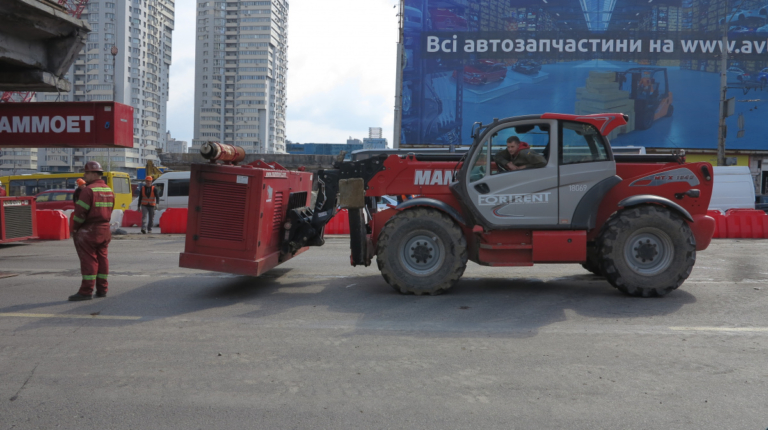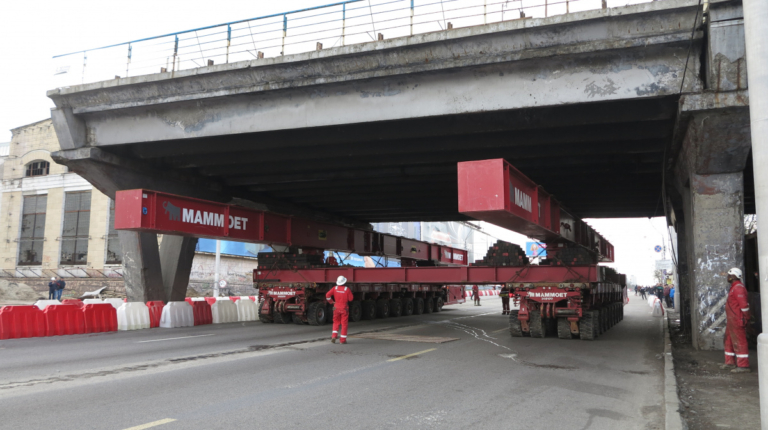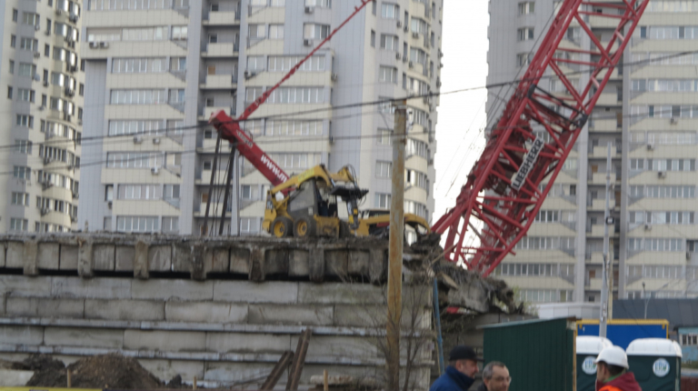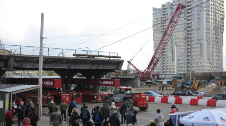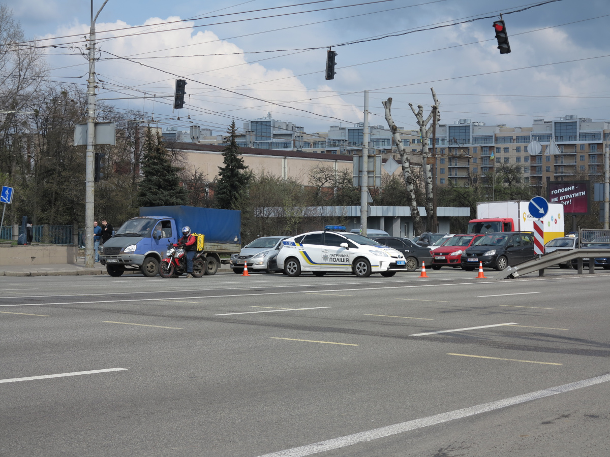 Мы уже писали о том, что Шулявский мост начали активно разбирать ровно месяц назад – 17 марта. Для этого задействовали гигантский 600-тонный гусеничный кран Liebherr. Затем принялись демонтировать пролеты, для чего был привезен из Нидерландов огромный колесный домкрат. И 17 апреля можно было наблюдать за его работой. Для этого полицейские перекрыли проспект Победы, точнее одну его сторону со стороны метро Шулявская и пустили оба потока машин по противоположной стороне, разделив их пластиковыми барьерами.
