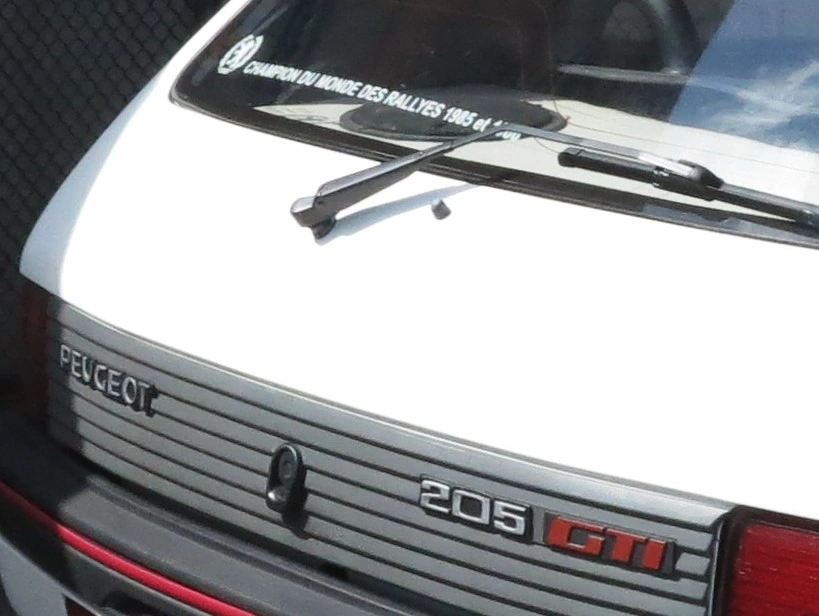 На заднем стекле представленного Peugeot 205 GTI можно увидеть интересную надпись: Сhampion du monde des Rallyes 1985 et 1986. Оказывается, специально подготовленный, 200-сильный автомобиль 205 Turbo 16 два года подряд выигрывал Чемпионат мира по ралли.