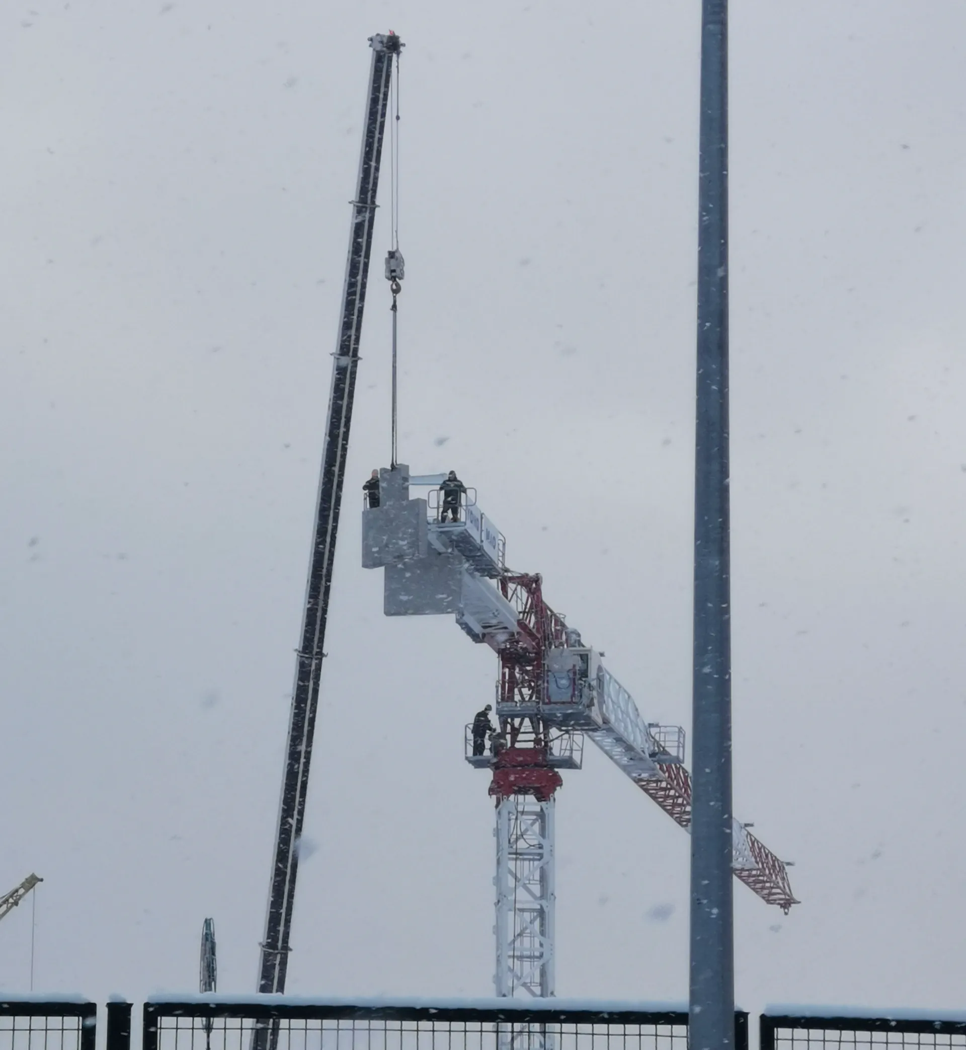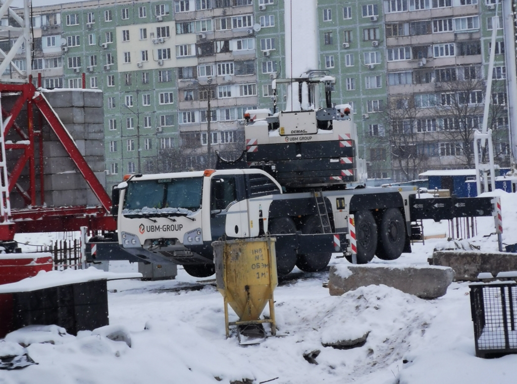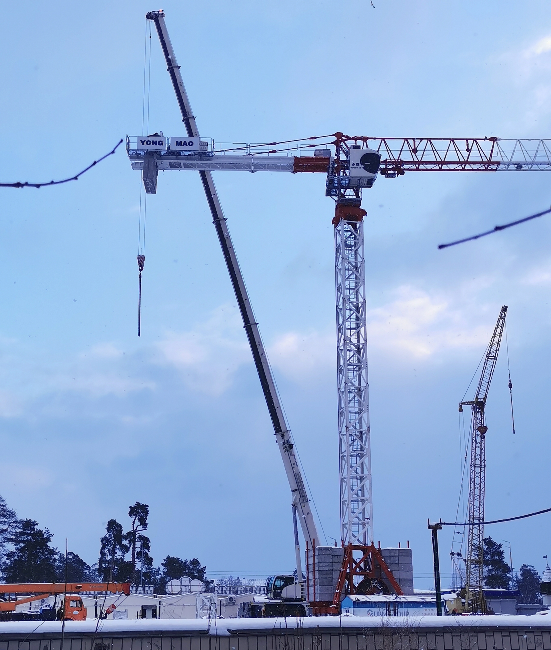 Замеченный на стройплощадке в Киеве мобильный кран Demag AC 100-4L выполнял важную миссию, а именно помогал установить башенный кран Yongmao. На фотографии хорошо видно, как он поднимает немаленькие железобетонные противовесы, которые в считанные минуты займут свое место на головокружительной высоте.